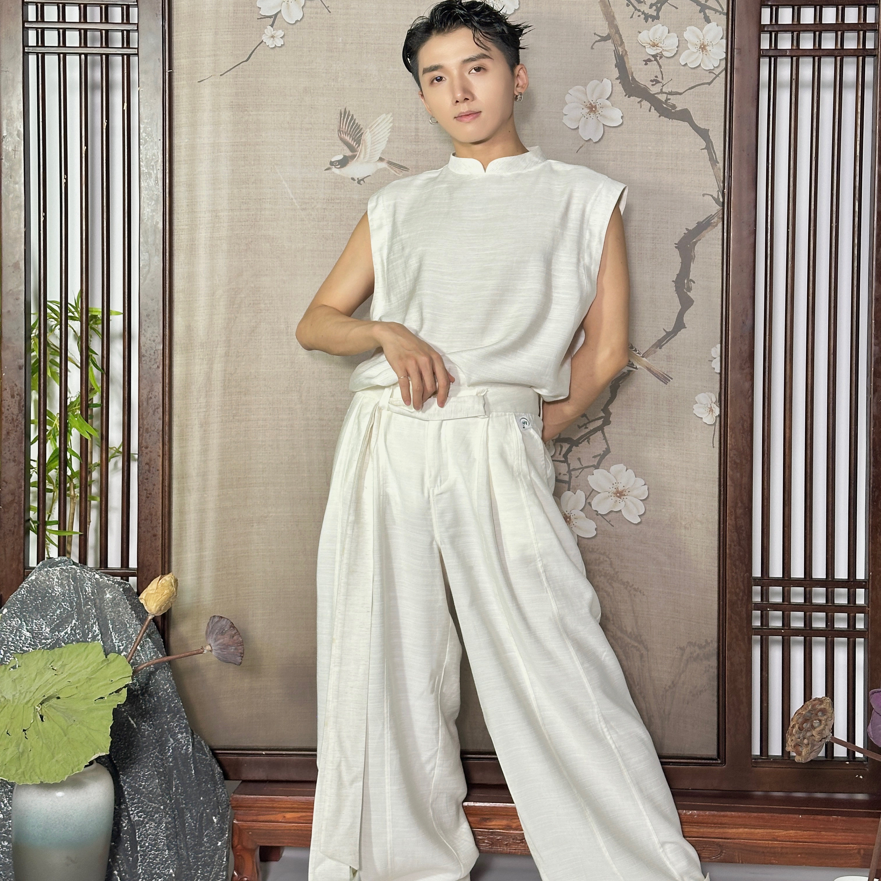 【余二制衣】新中式亚麻花白立领背心飘带西装裤套装