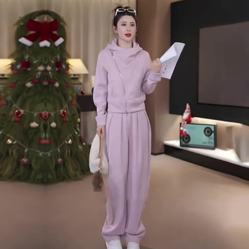 2025春秋新款韩版休闲运动服套装女洋气百搭连帽斜拉链卫衣阔腿裤