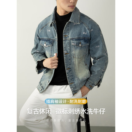 【复古轻奢风】刺绣牛仔外套男水洗做旧插肩袖高级感夹克欧美潮流
