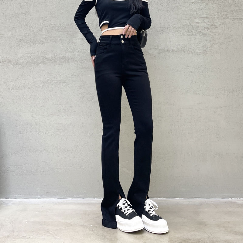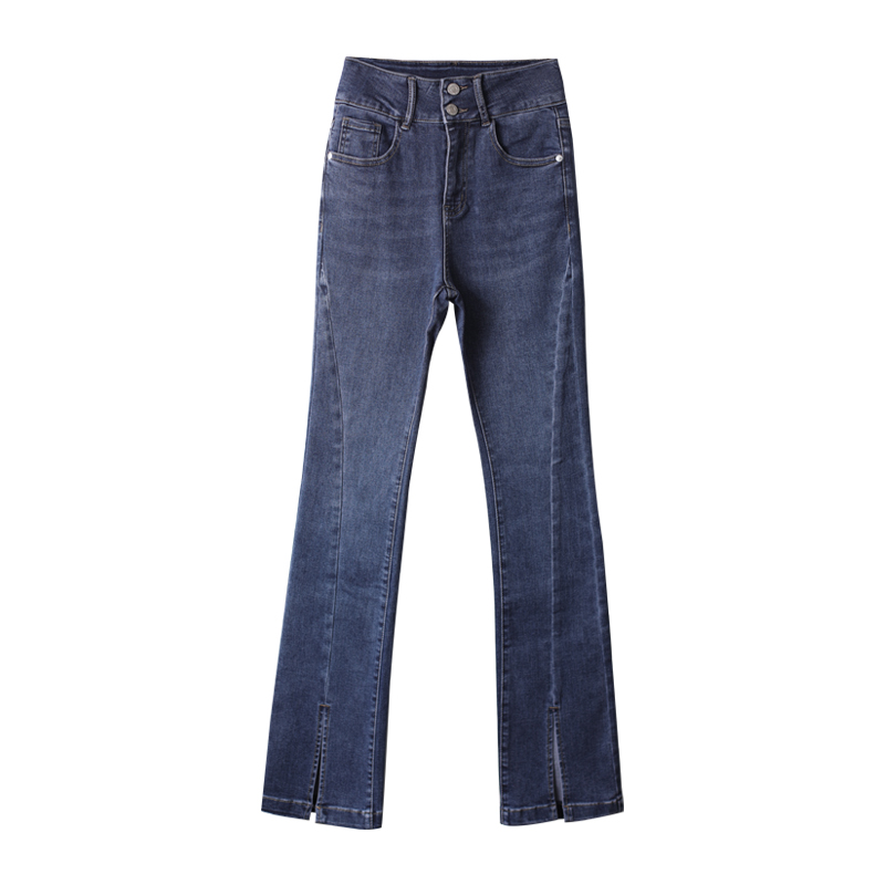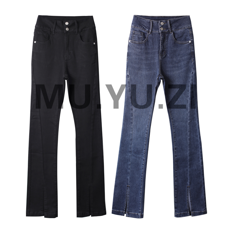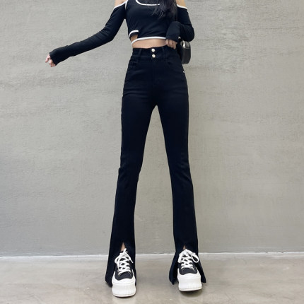 前开叉牛仔喇叭裤女春秋高腰高弹力修身显瘦微喇直筒女士拖地长裤