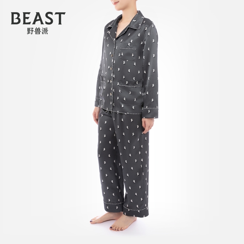 野兽派熊猫噗噗印花22姆米真丝睡衣长袖长裤家居服生日礼物节日
