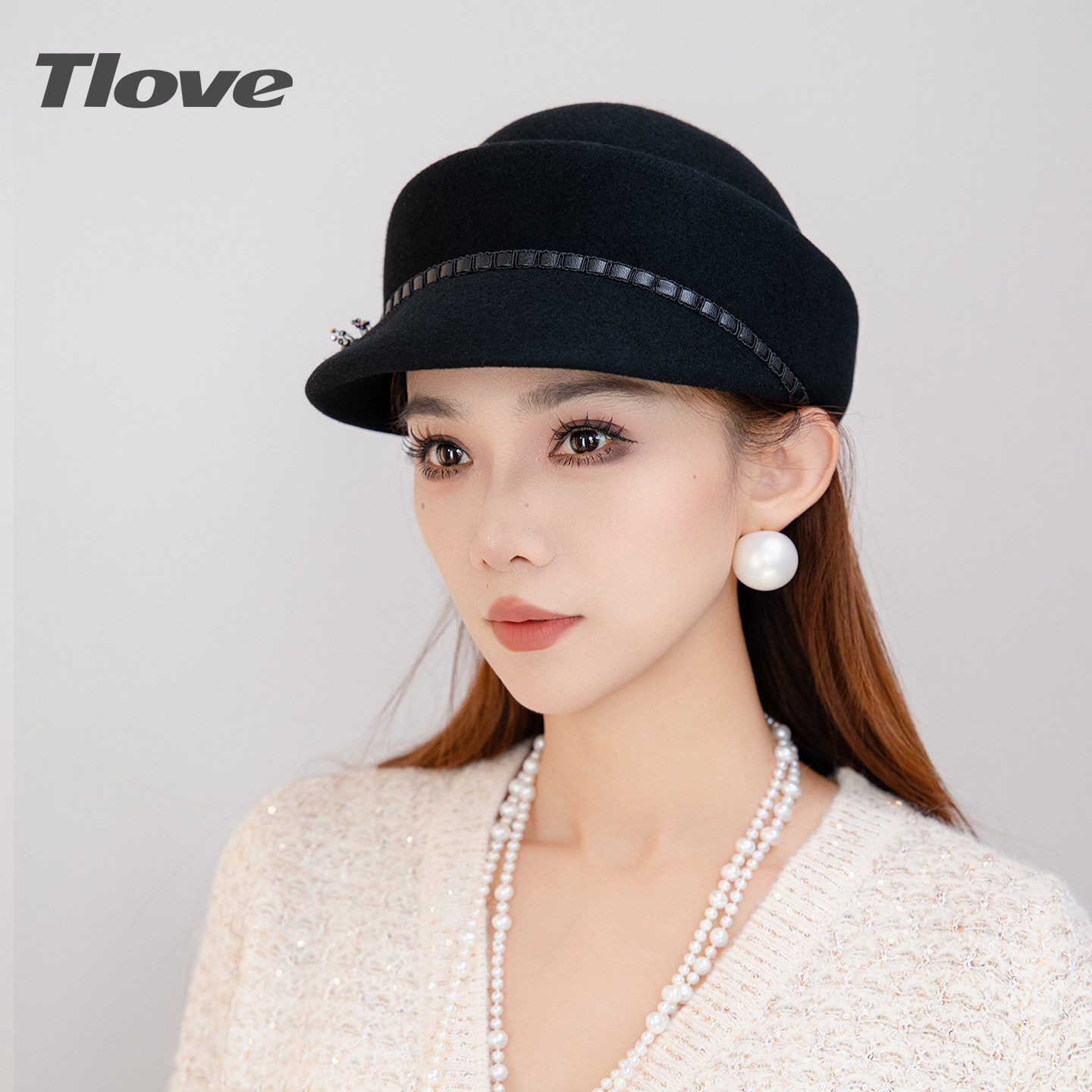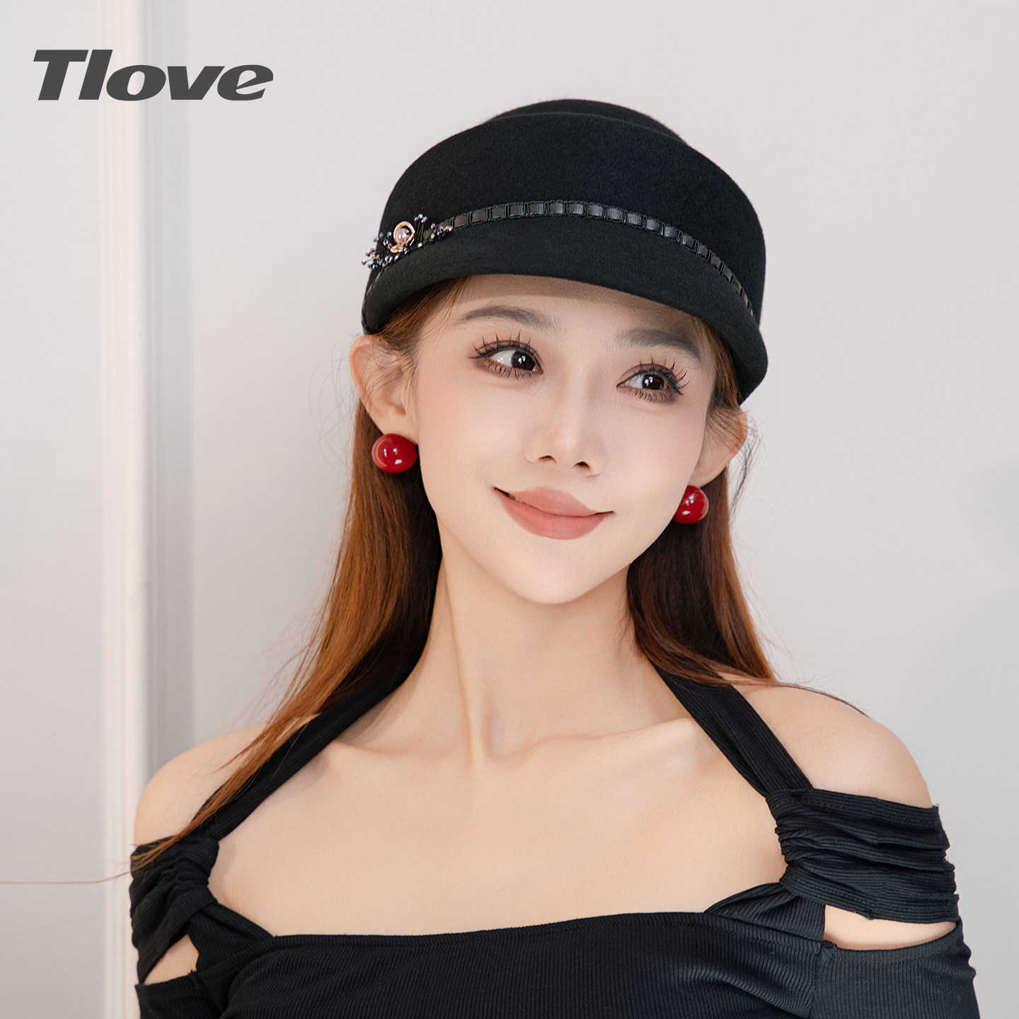 9146秋冬季新款时尚百搭圆顶马术帽出街潮流羊毛帽子女士黑毛呢帽
