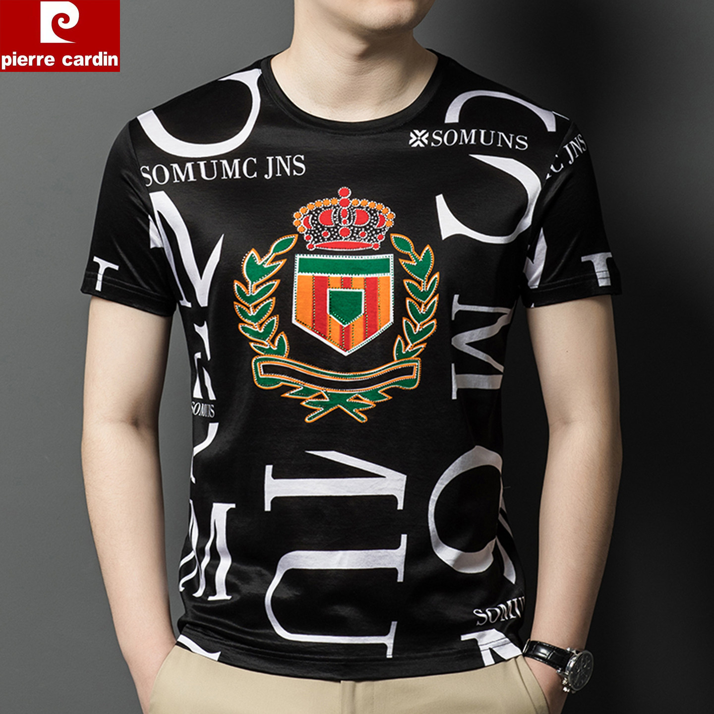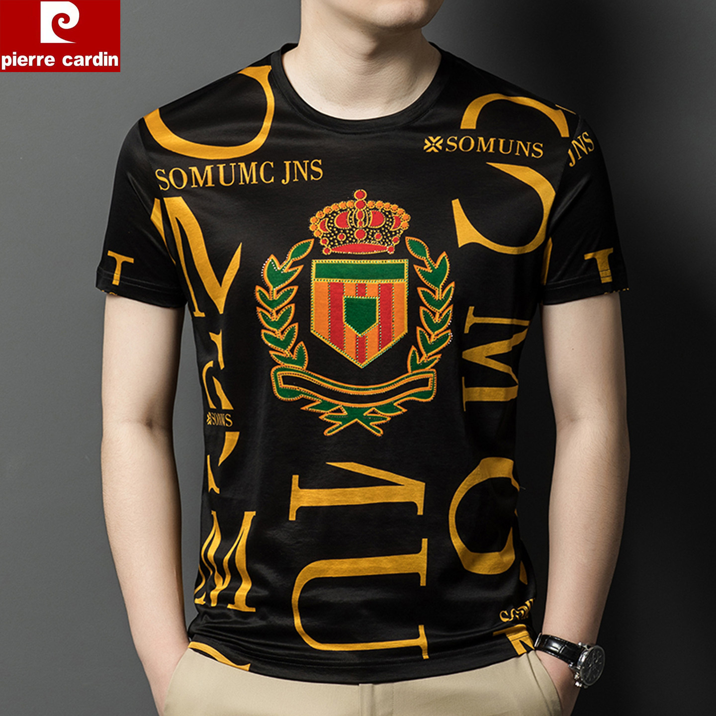 皮尔卡丹中国风冰丝印花短袖T恤男圆领潮流高级感碎花半袖汗衫男