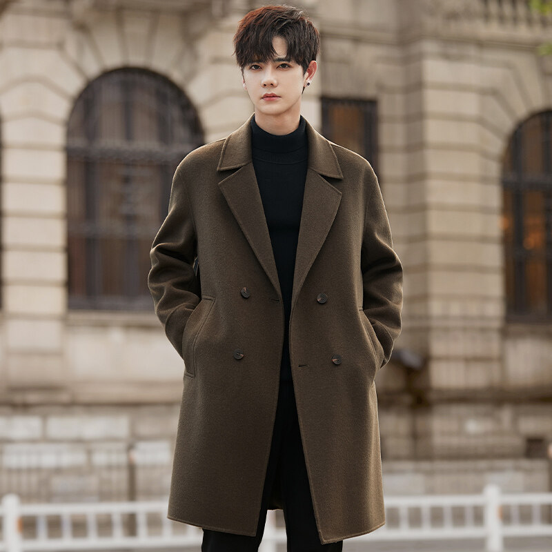 格子毛呢大衣男中长款2024冬季新款潮流男士高端宽松连帽风衣外套