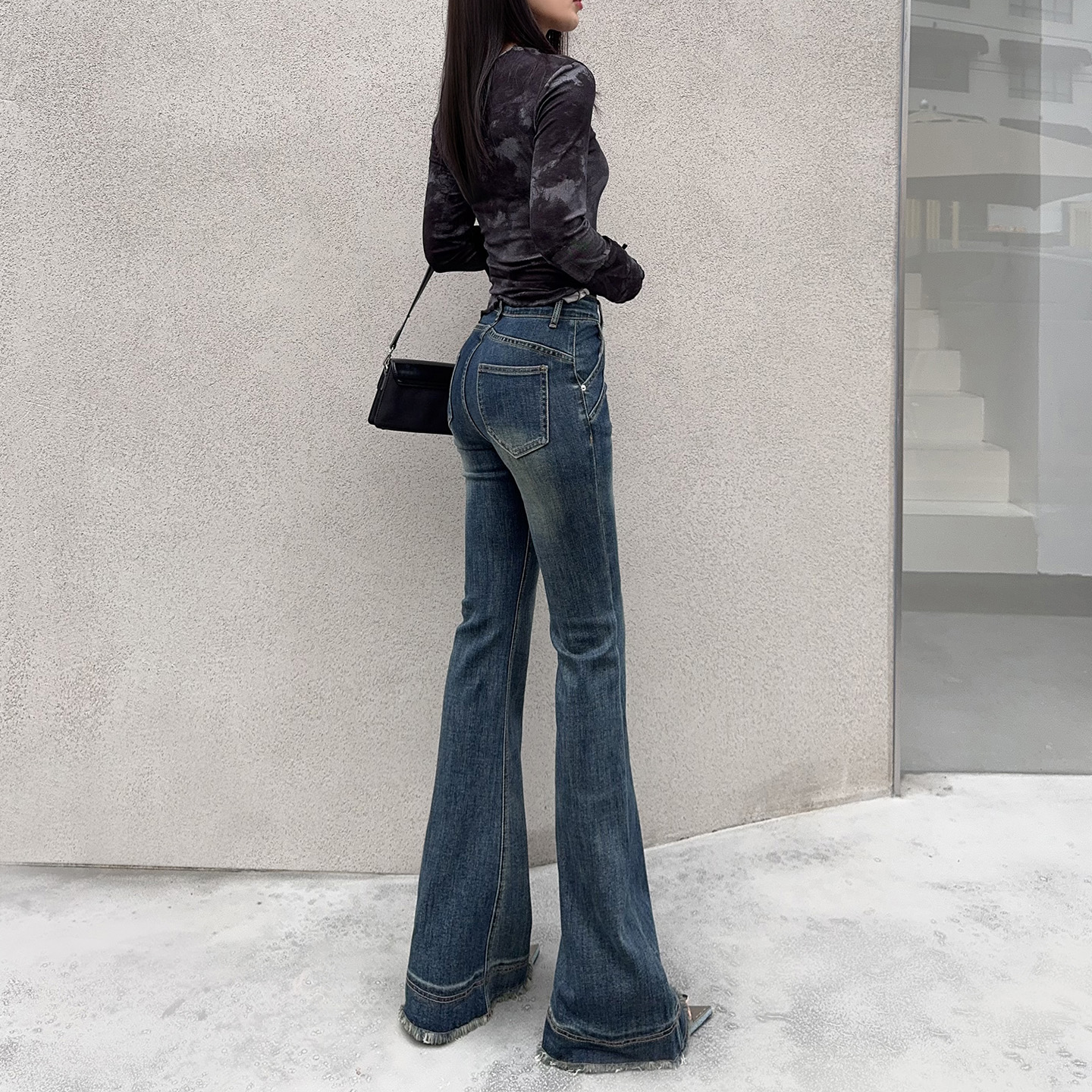 杨杨 复古蓝毛边微喇叭牛仔裤女秋季高腰显瘦显腿长弹力提臀长裤