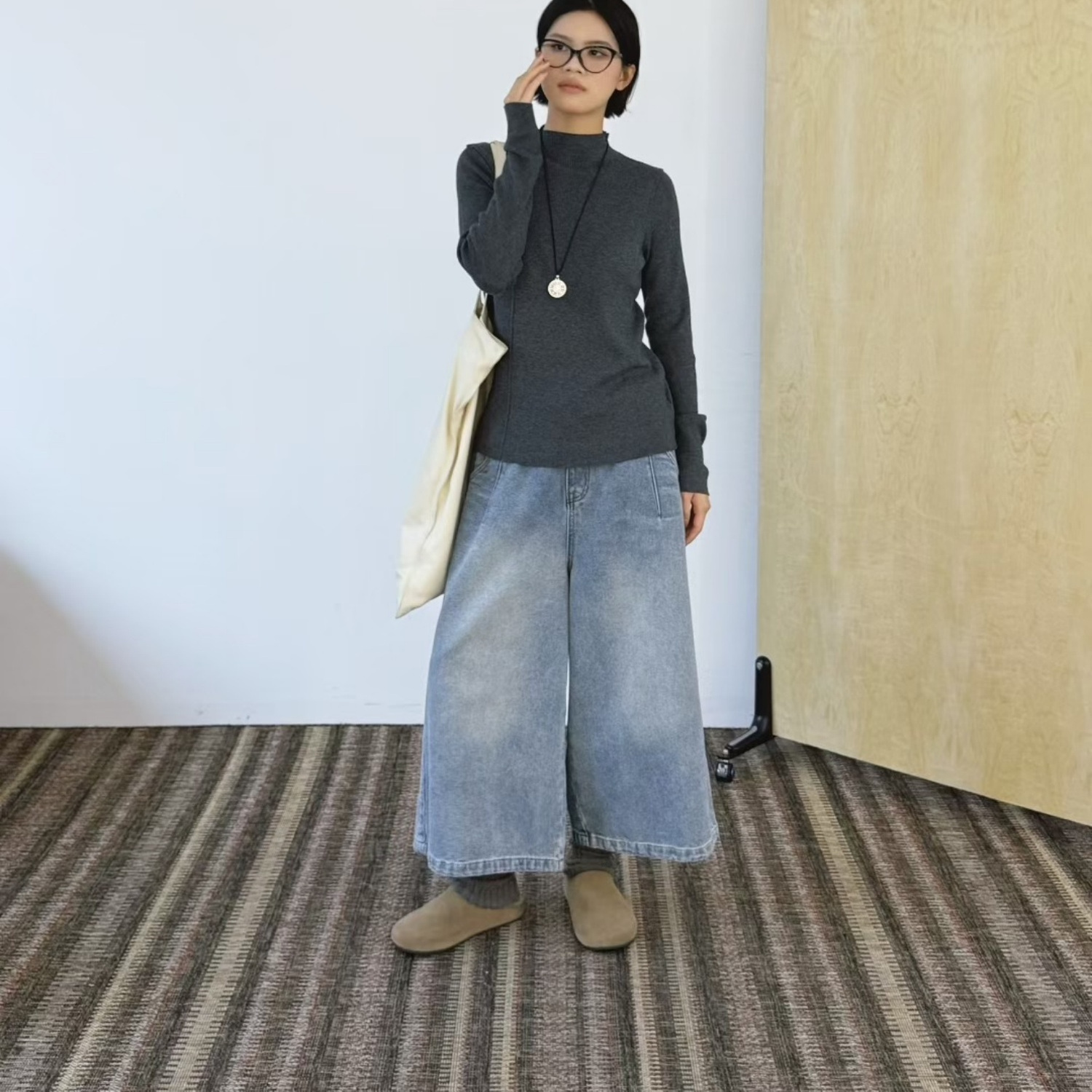 幕茄女装A5680秋韩版宽松大码胖mm休闲慵懒风高腰阔腿牛仔九分裤