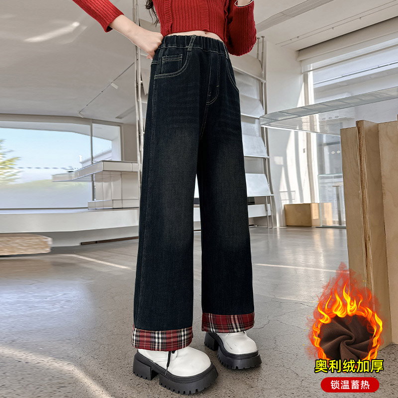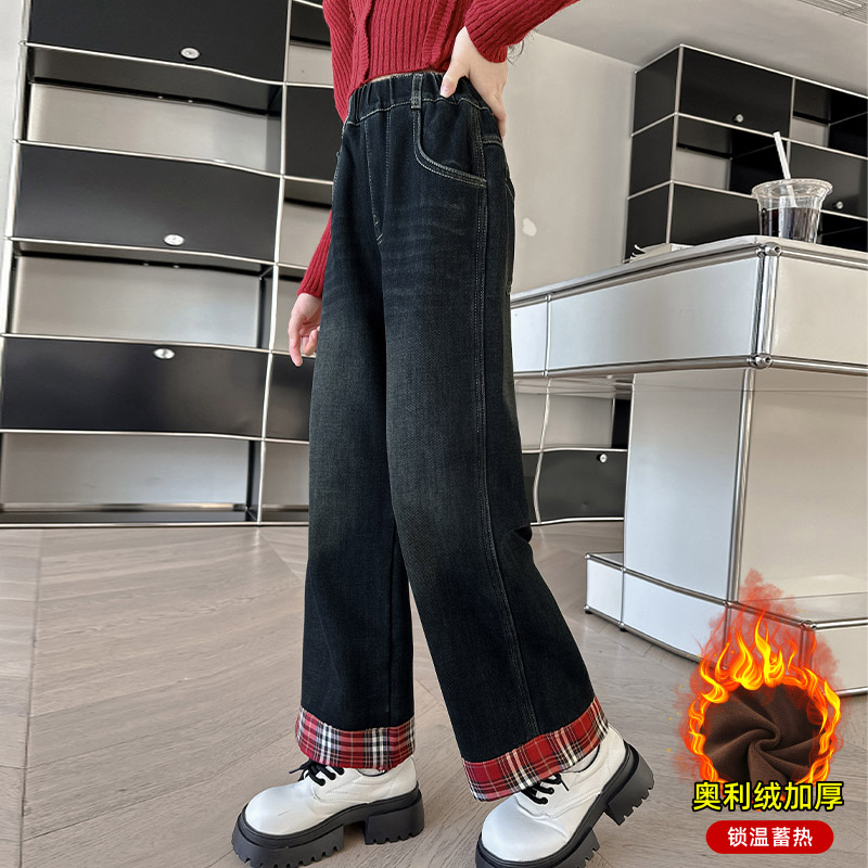 女童加绒牛仔裤秋冬款儿童加厚一体绒裤子大童冬季好看直筒阔腿裤