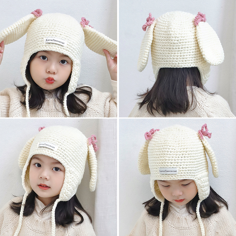 可爱兔耳蝴蝶结儿童针织毛线帽子