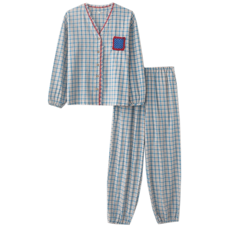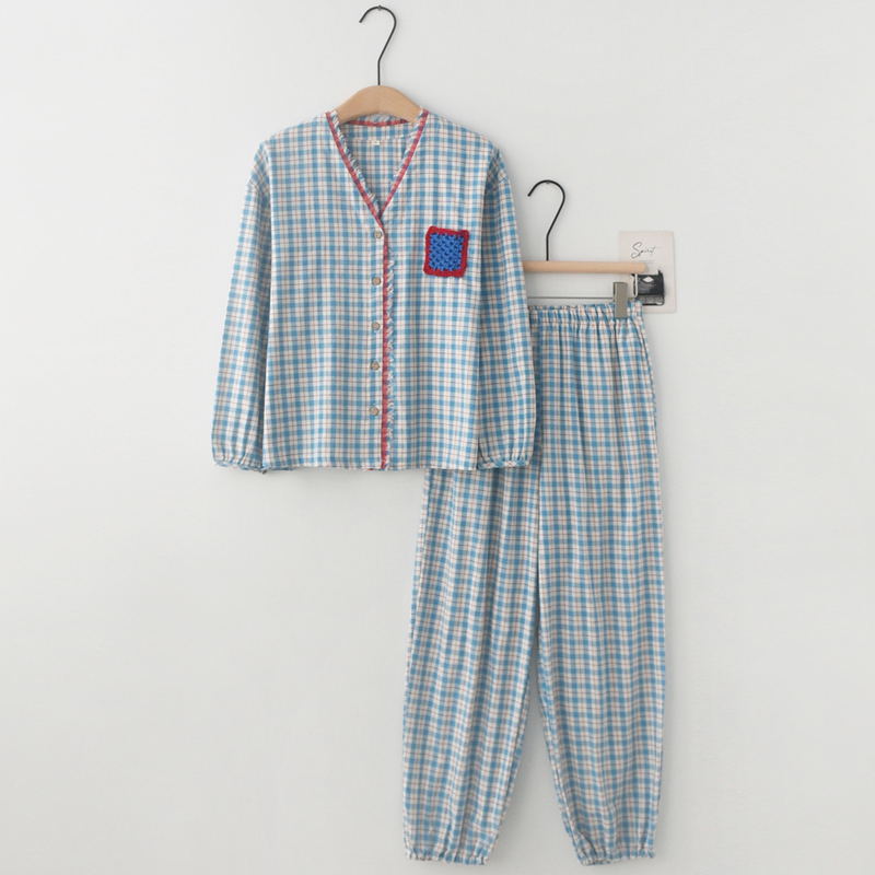 纯欲风清爽蓝格纹睡衣女款春夏季纯棉棉布V领长袖长裤家居服套装