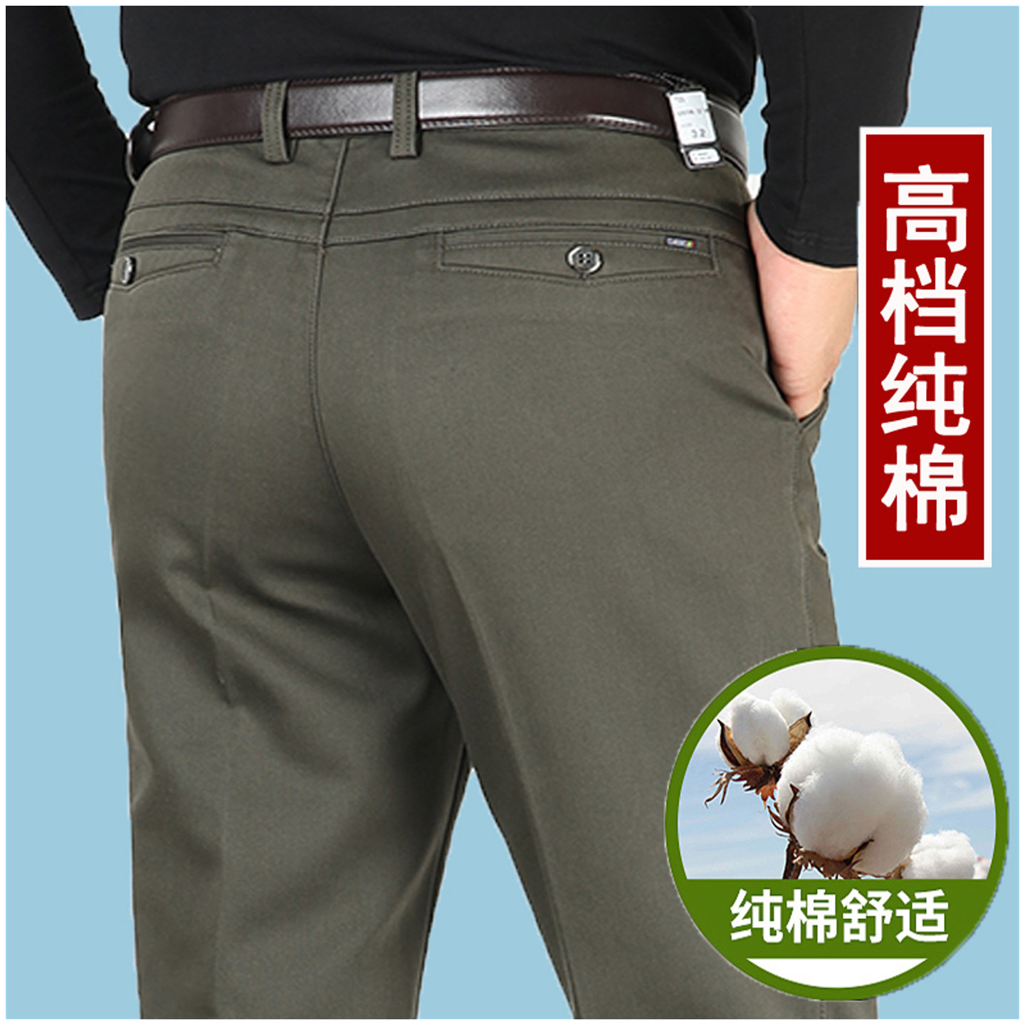 虎都纯棉休闲裤男中老年高腰宽松爸爸裤秋冬厚款中年直筒免烫男裤