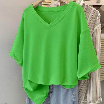 300斤外贸白色短袖T恤女V领夏新款宽松大码女装纯色体恤百搭上衣