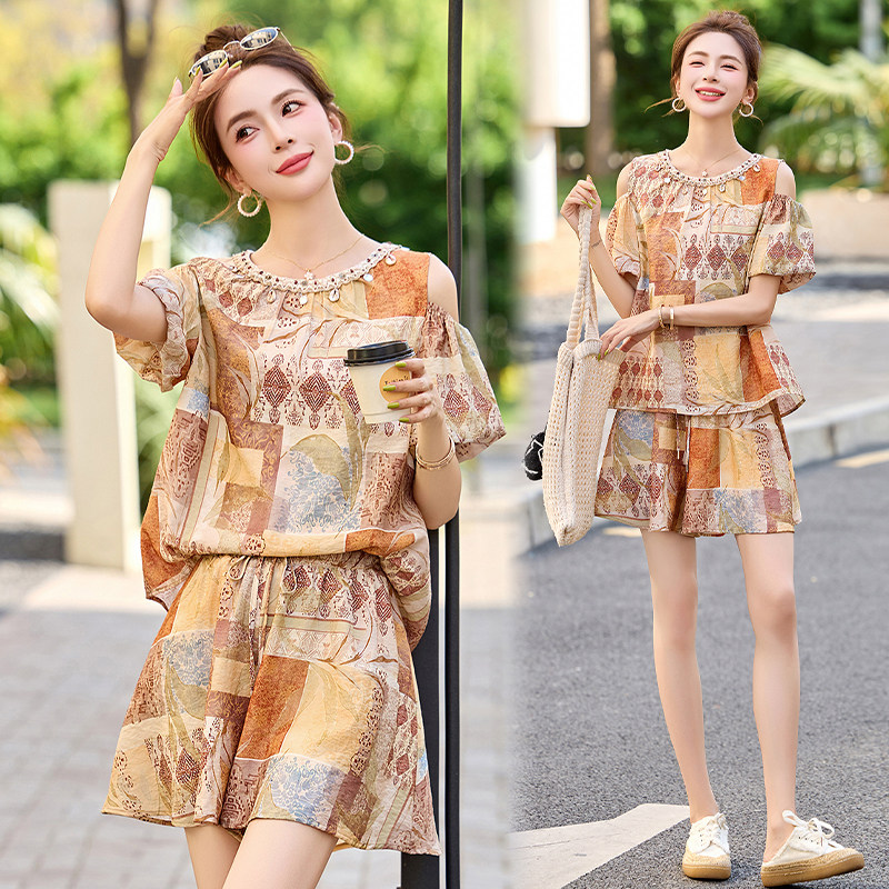 时尚套装女2025夏季新款小香风设计感超好看洋气印花短裤两件套潮