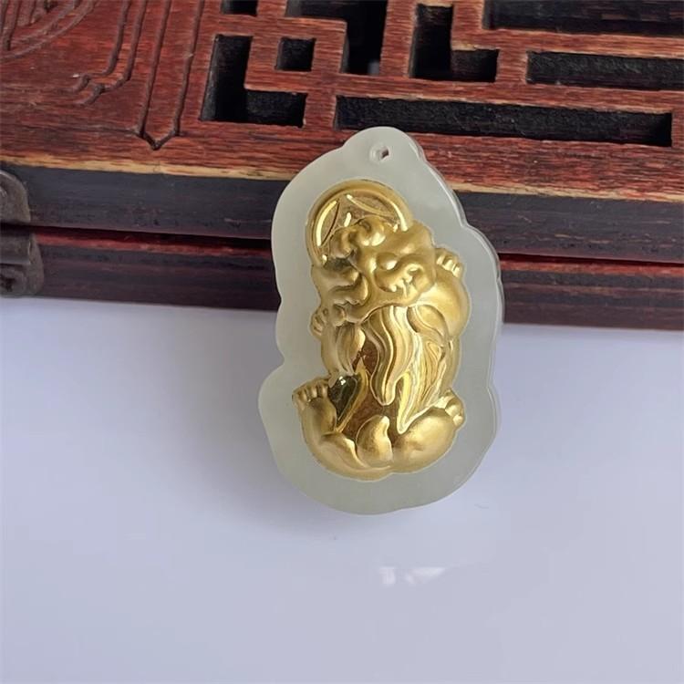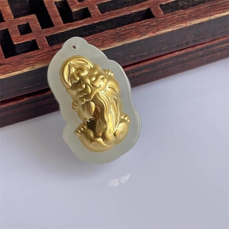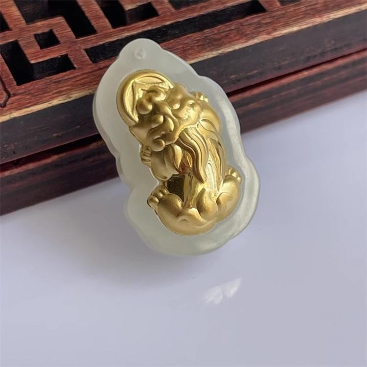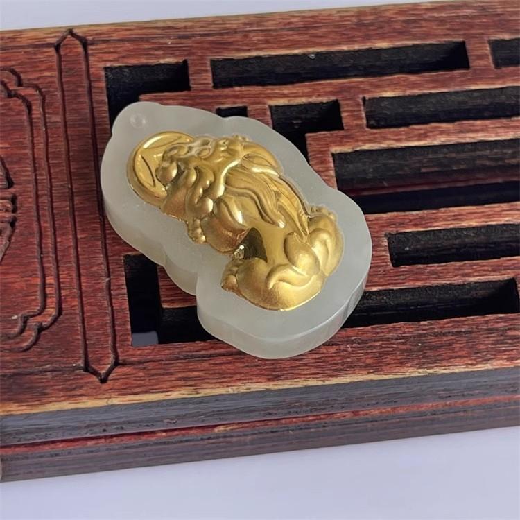 黄金足金镶嵌天然和田玉招财貔貅金镶玉项链吊坠挂件玉石镶嵌男女