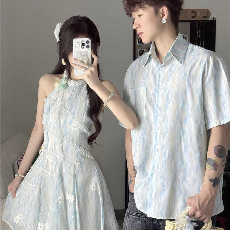 情侣装夏季2025小众设计感韩版短袖衬衫男女连衣裙法式一裙一衣潮