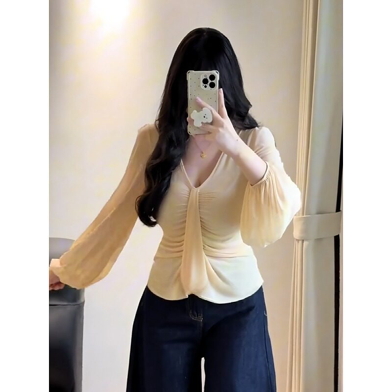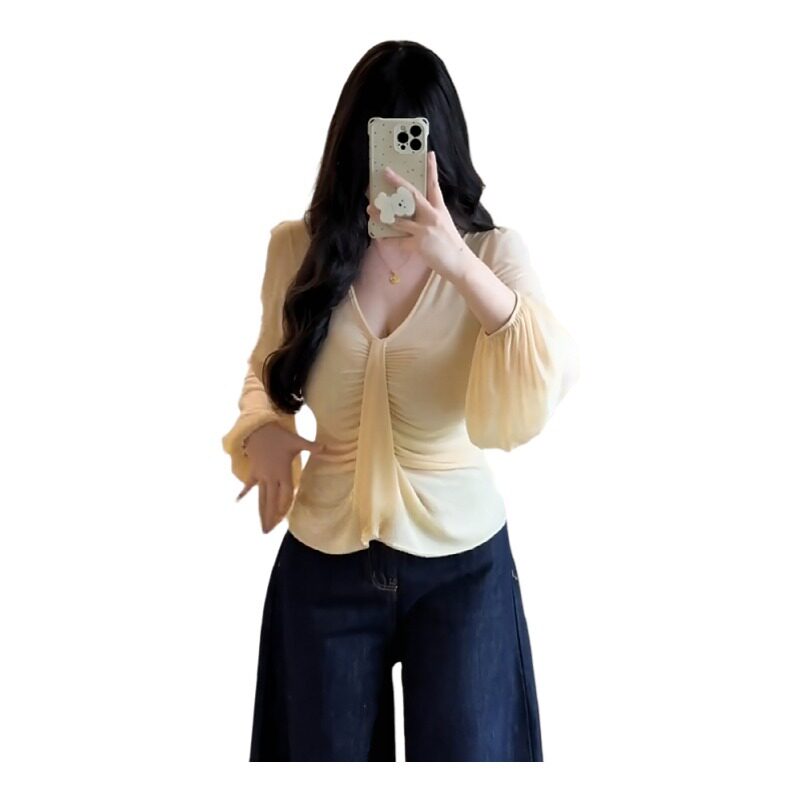 大码纯欲风v领捏褶掐腰上衣女秋季新款t恤胖mm气质时尚内搭打底衫