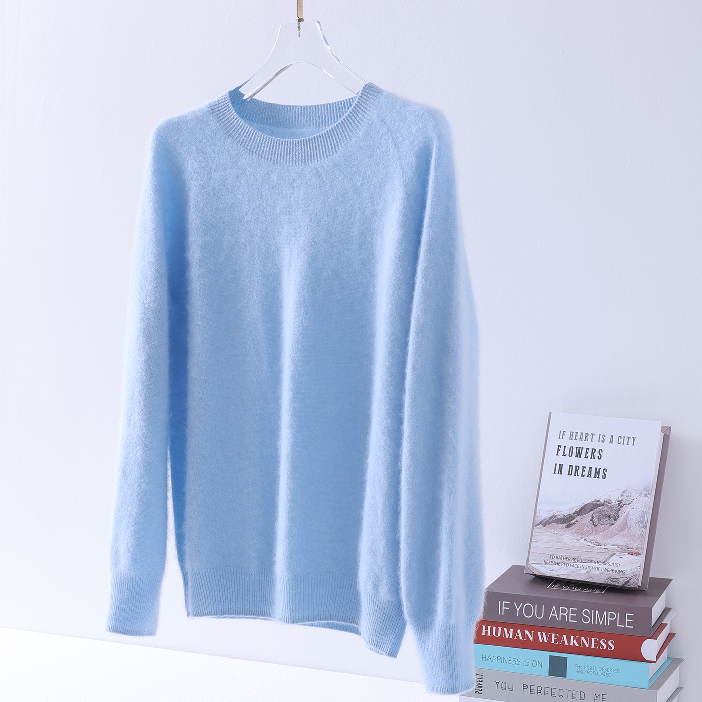 爆款拉毛羊绒羊毛衫女圆领无缝一体套头灰色针织毛衣秋冬新款宽松