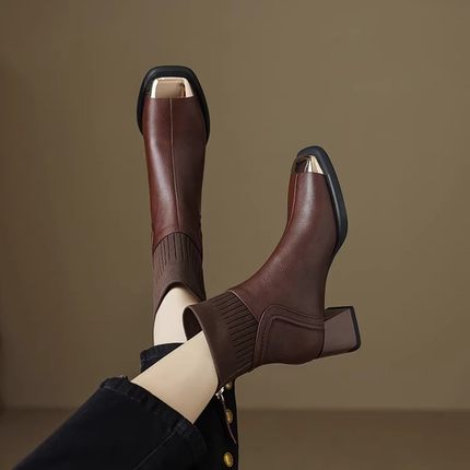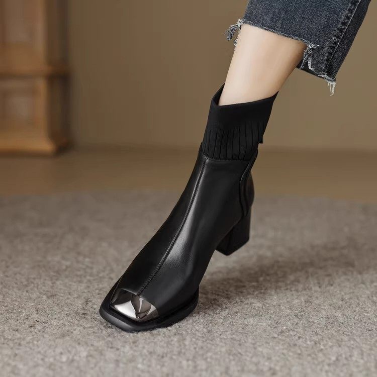 洋气小短靴女靴春秋单靴方头中跟高跟靴粗跟真皮毛线口后拉链袜靴