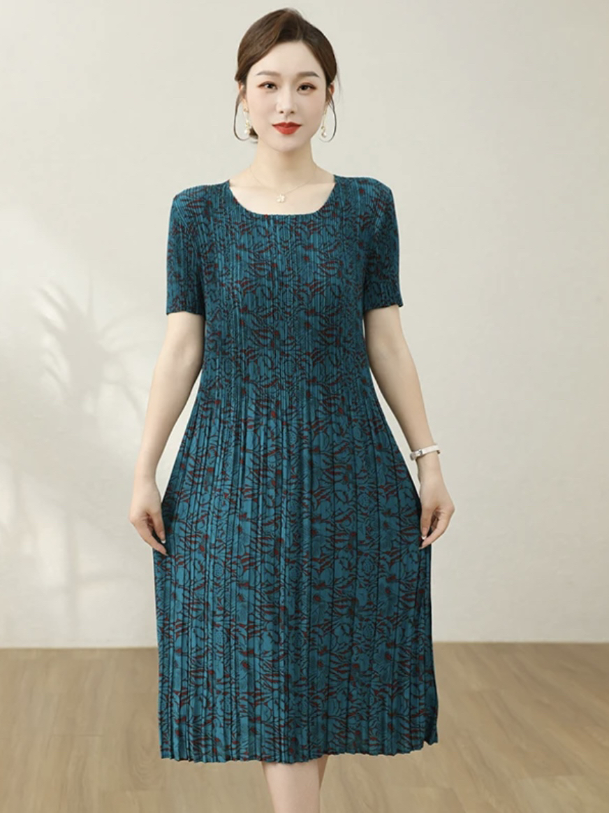 新款女装褶皱连衣裙夏季薄款真丝雪纺中年妈妈裙宽松显瘦短袖裙子