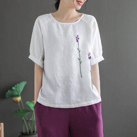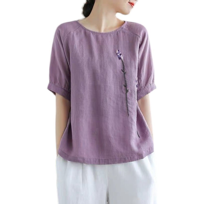文艺复古花朵刺绣棉麻圆领短袖T