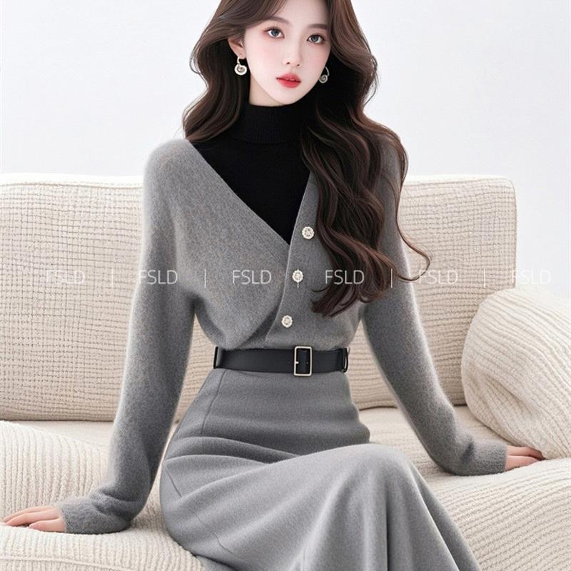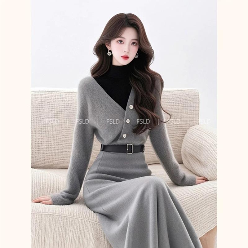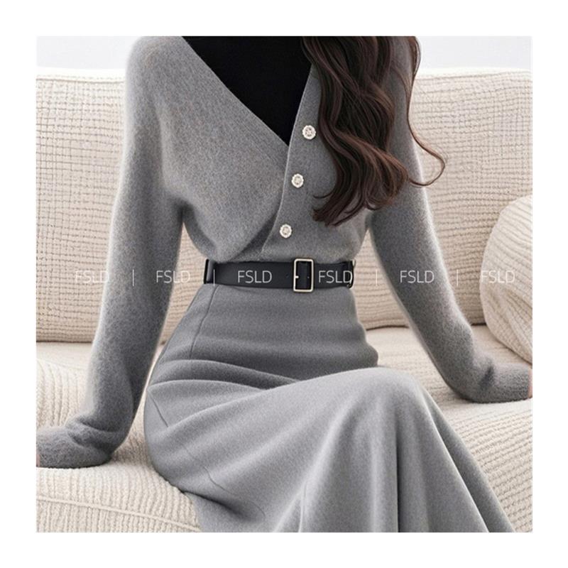 4069韩系搭配一整套冬装灰色假两件针织连衣裙子套装新款女装秋季