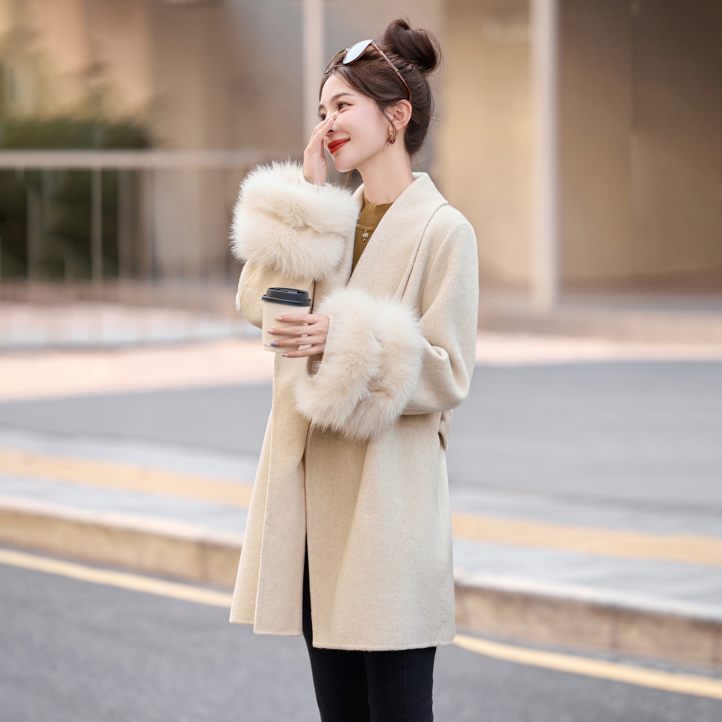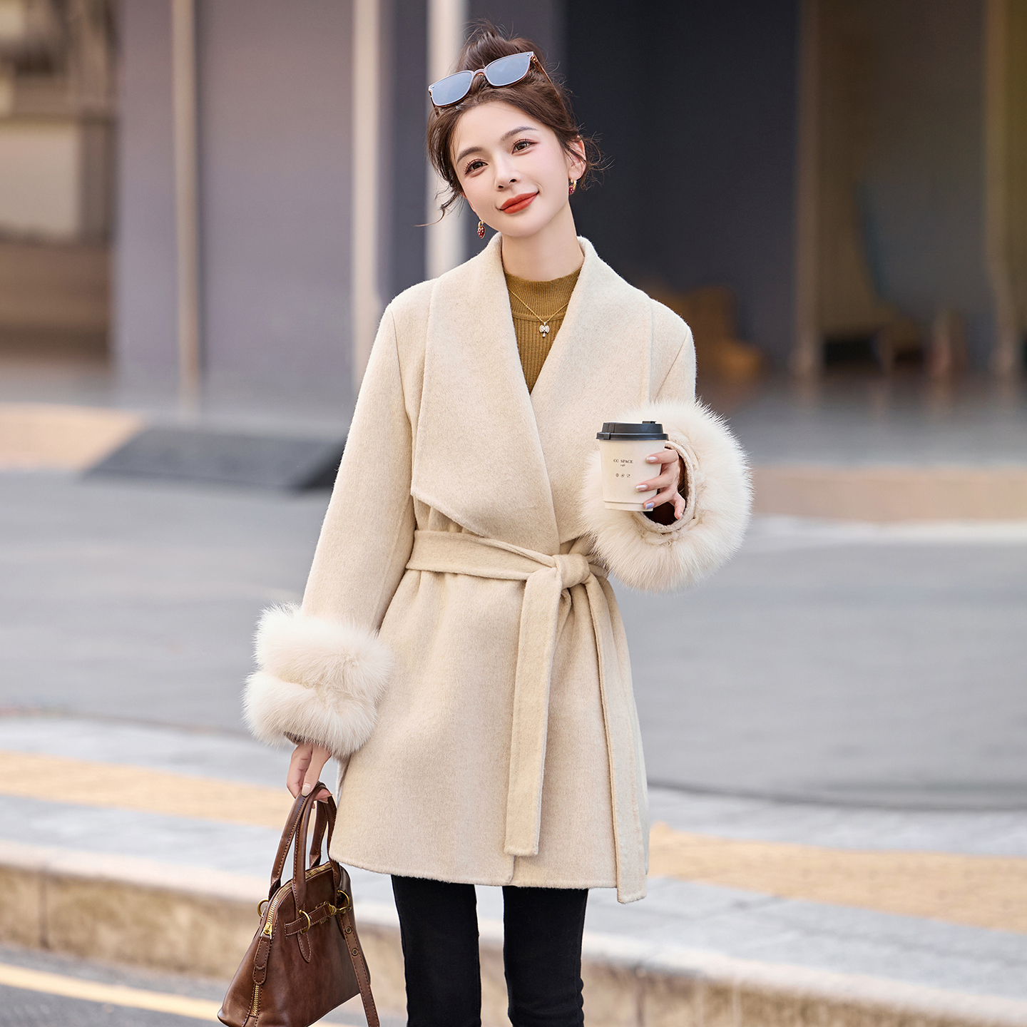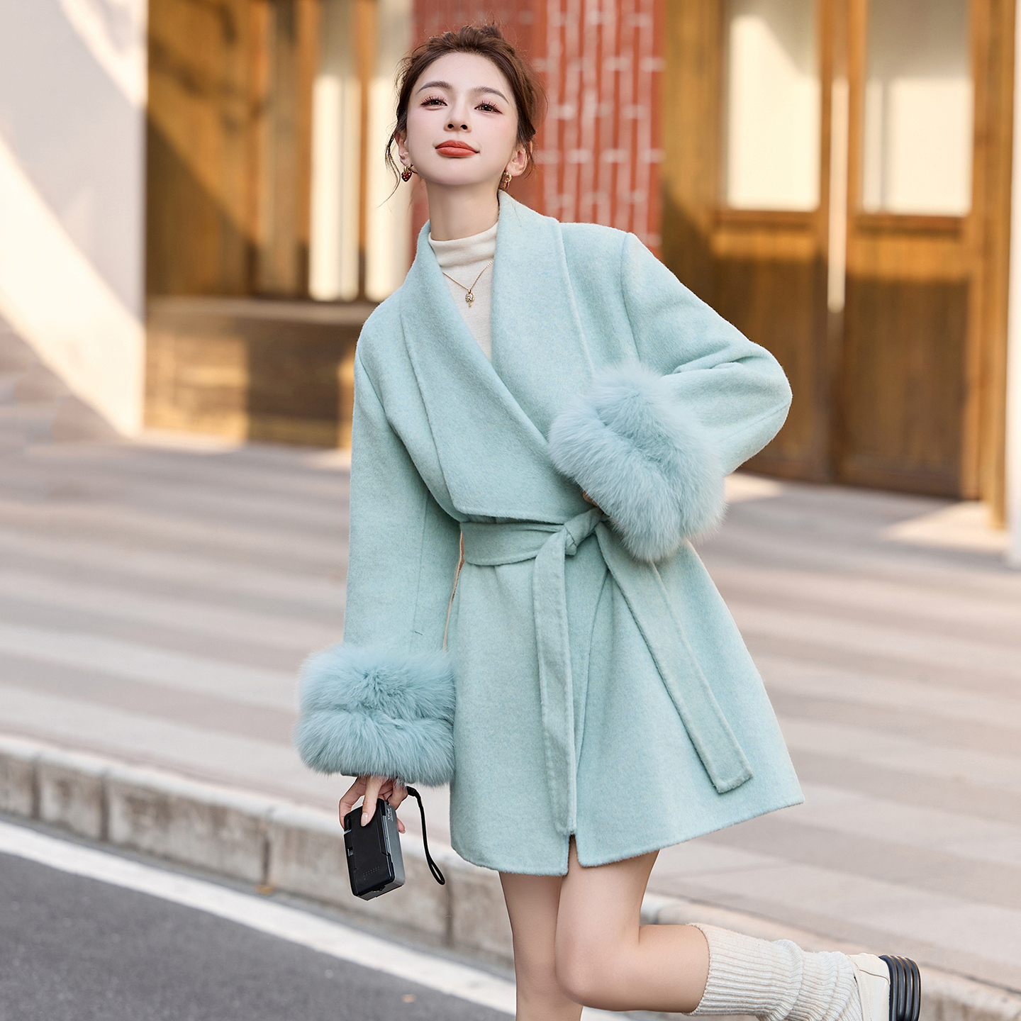 轻奢狐狸毛领羊毛呢外套女中长款2025秋冬新款斗篷双面呢子大衣