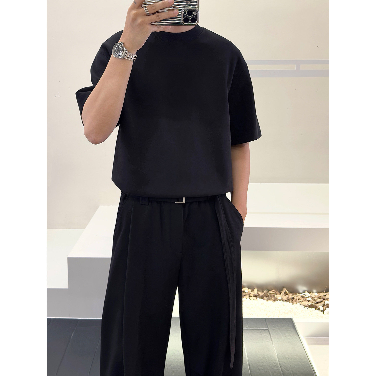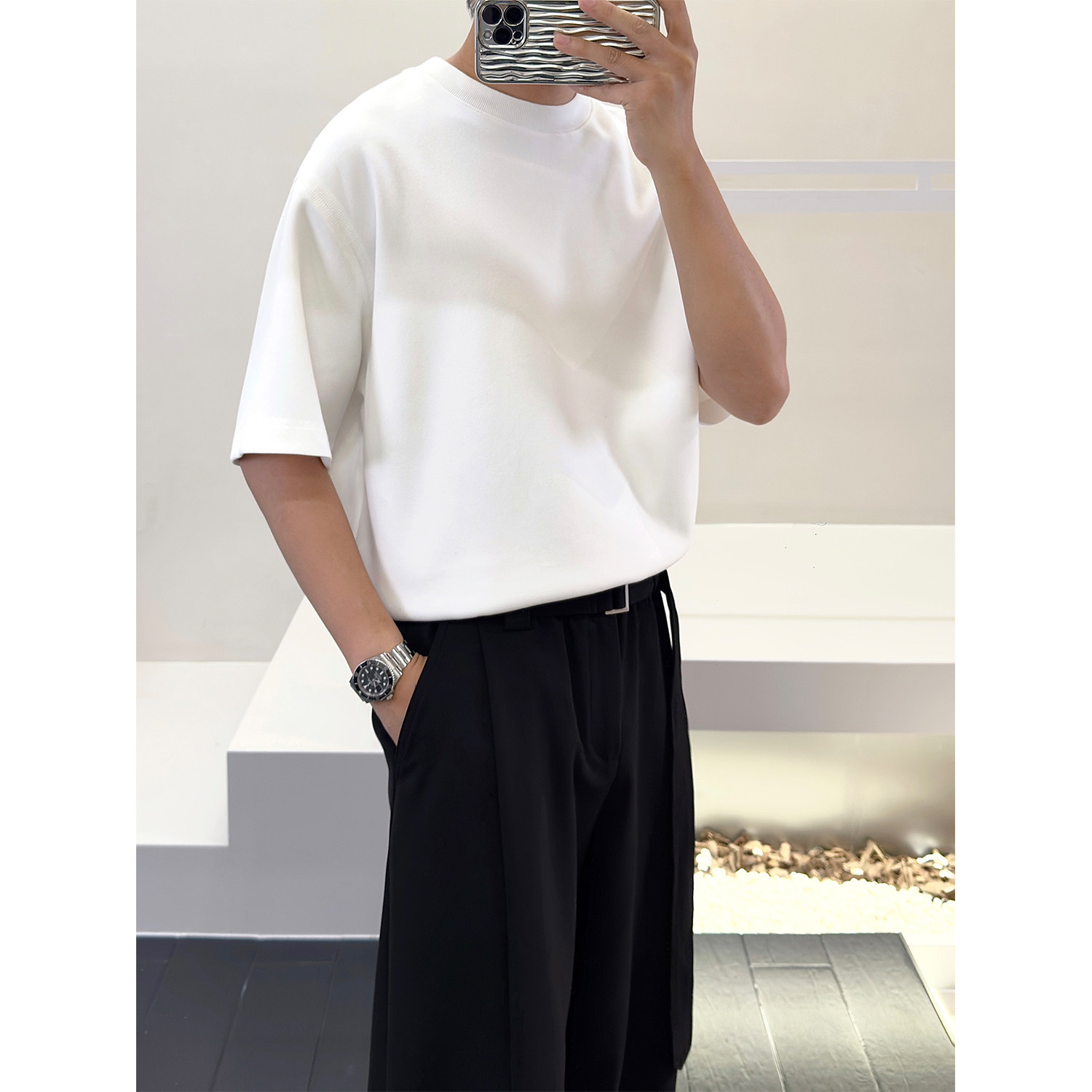 里奈男装【显肩宽】重磅320克太空棉短袖男打底衫宽松圆领T恤内搭