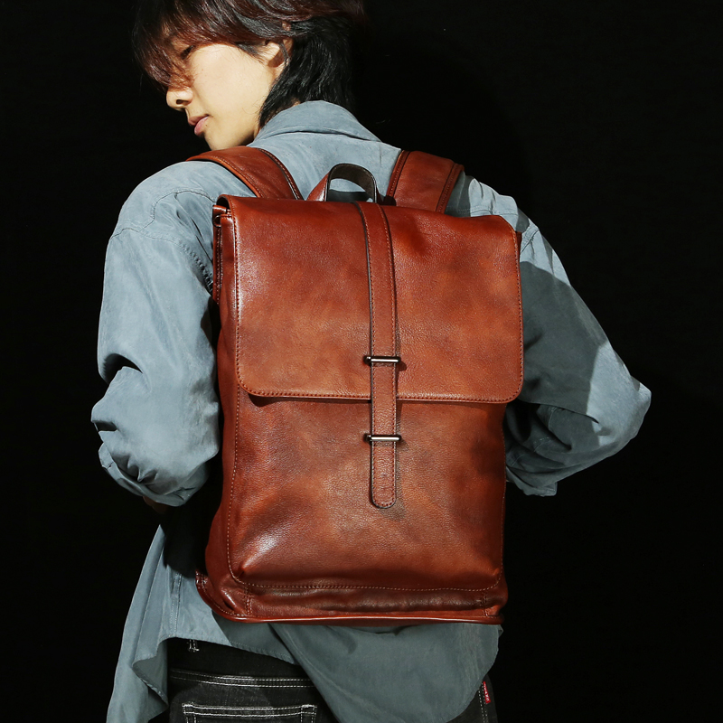 手工擦色植鞣皮复古背包休闲拉链双肩包牛皮青年书包男女真皮包包