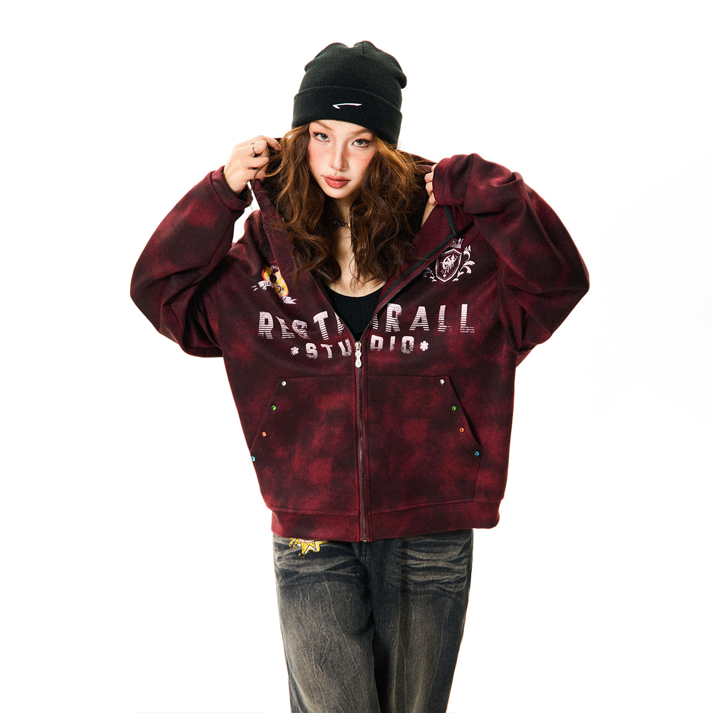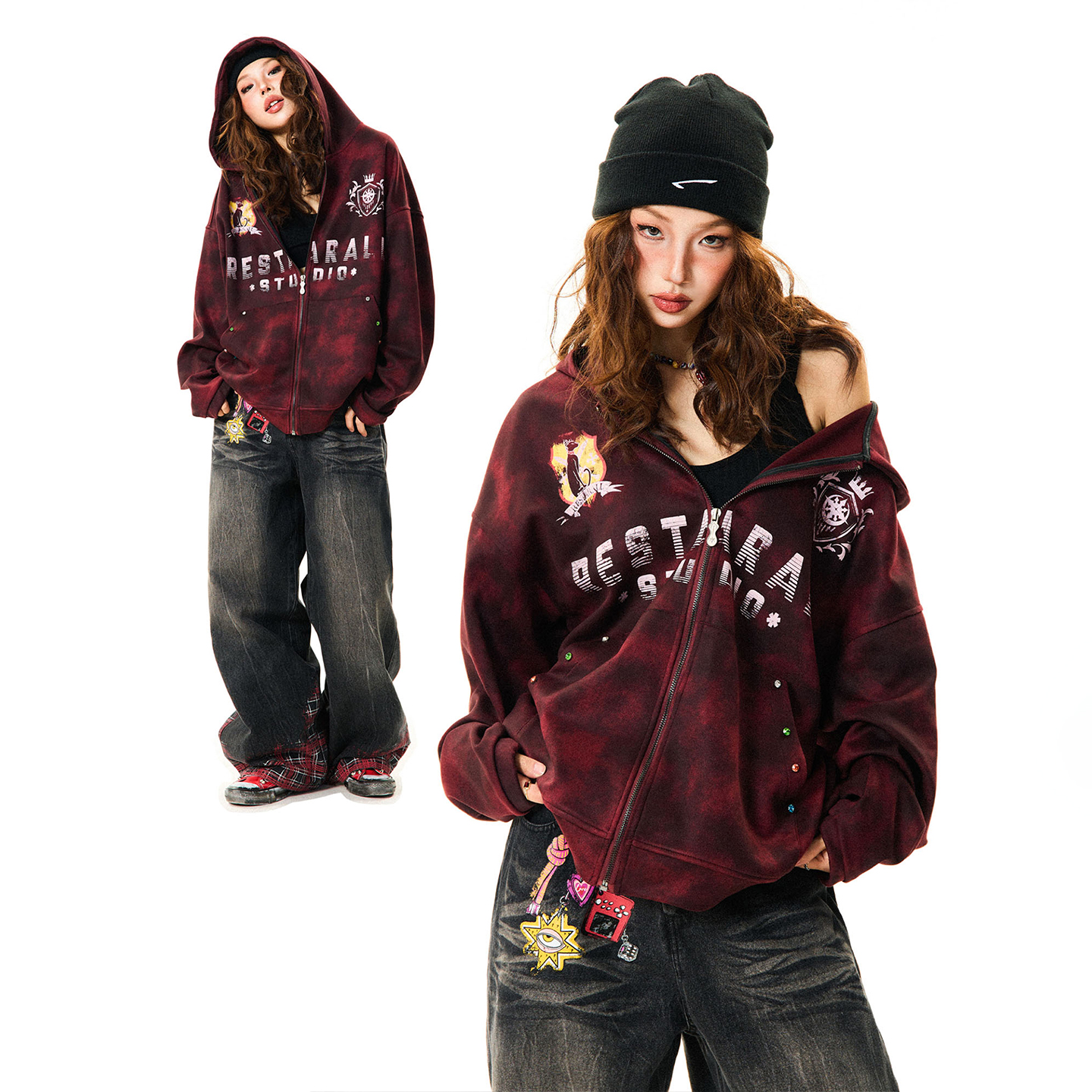 300斤特大码酒红色设计感连帽卫衣女胖mm宽松显瘦辣妹风开衫外套
