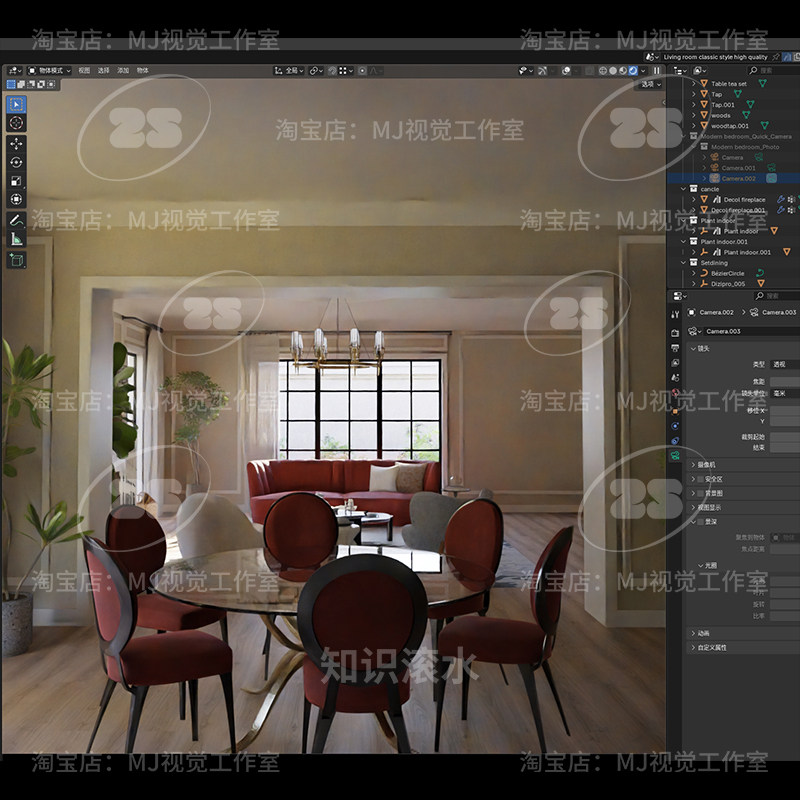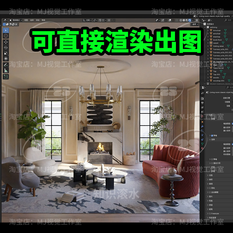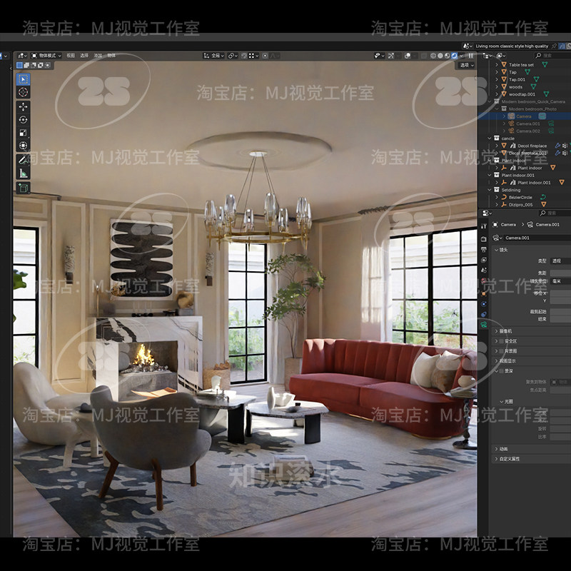 Blender豪华别墅客厅壁炉潮流艺术茶几北欧场景室内模型建模2606
