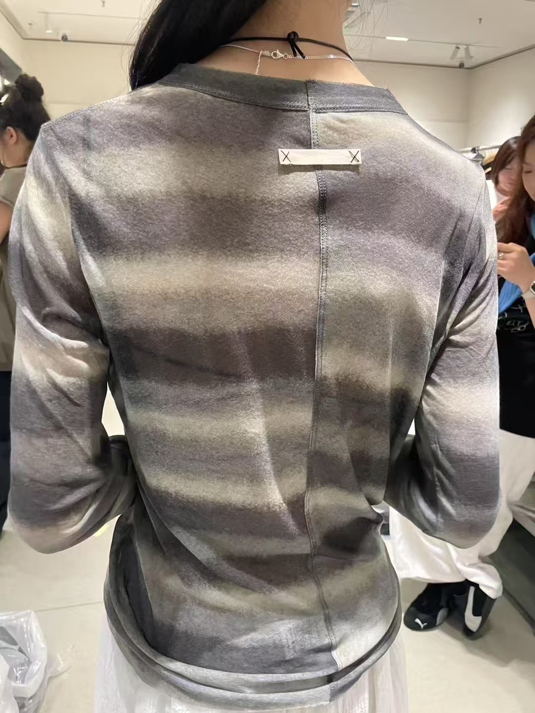 欧洲站2025秋印染条纹T恤独特薄款欧式网纱上衣小衫显瘦打底衫女