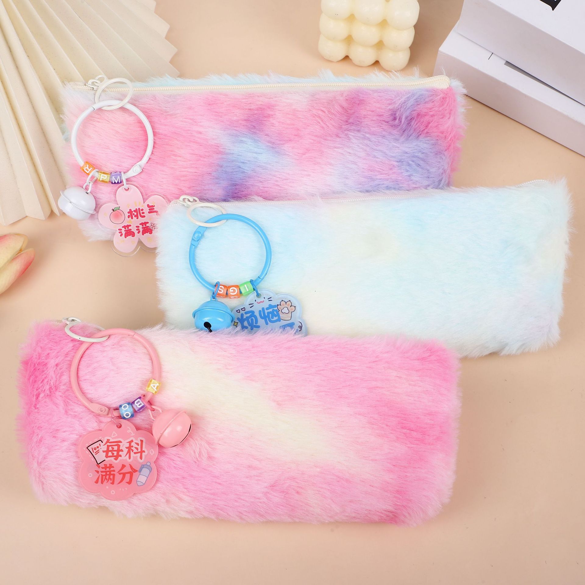 【送精美挂件】创意幻彩渐变色笔袋可爱女孩毛绒文具袋简约收纳袋