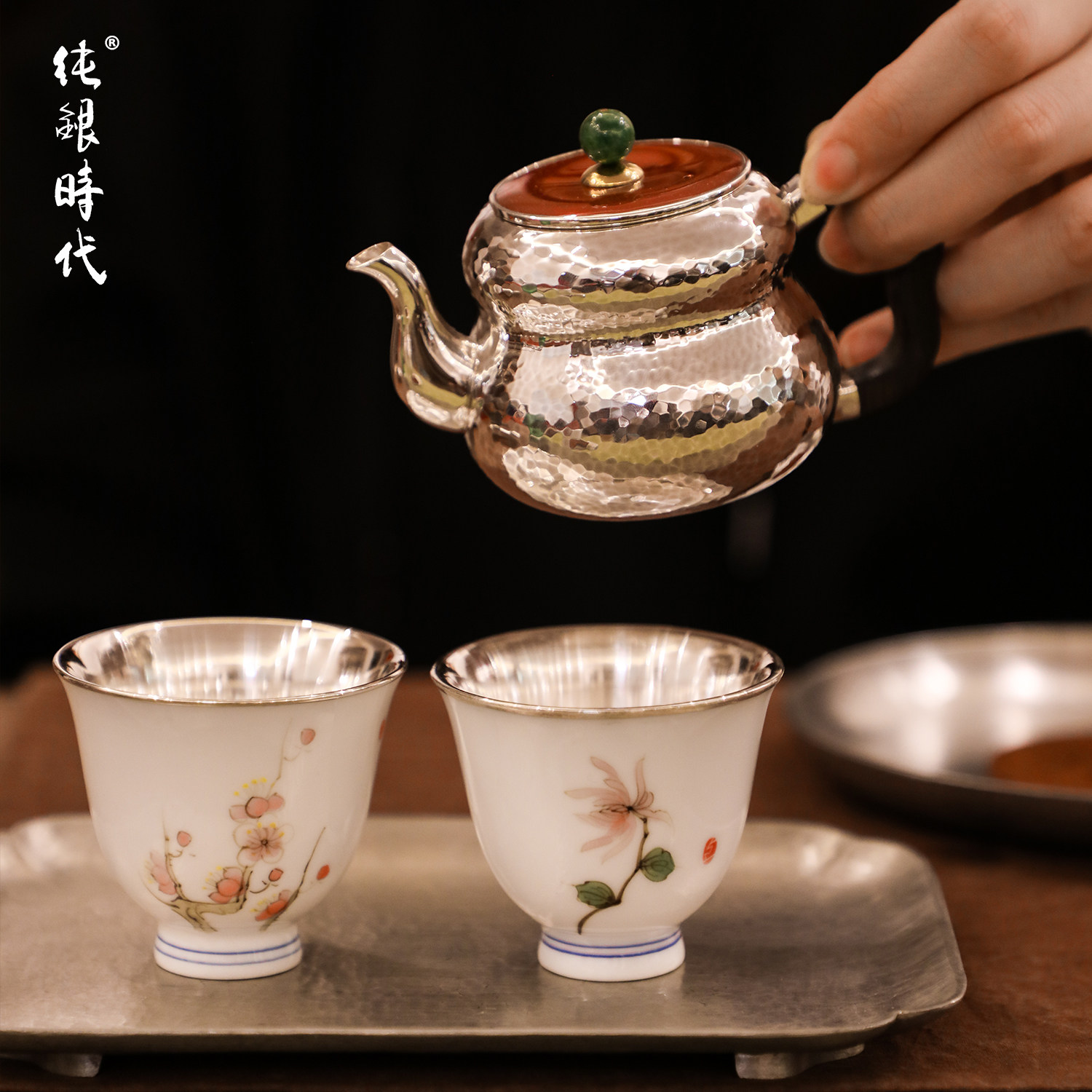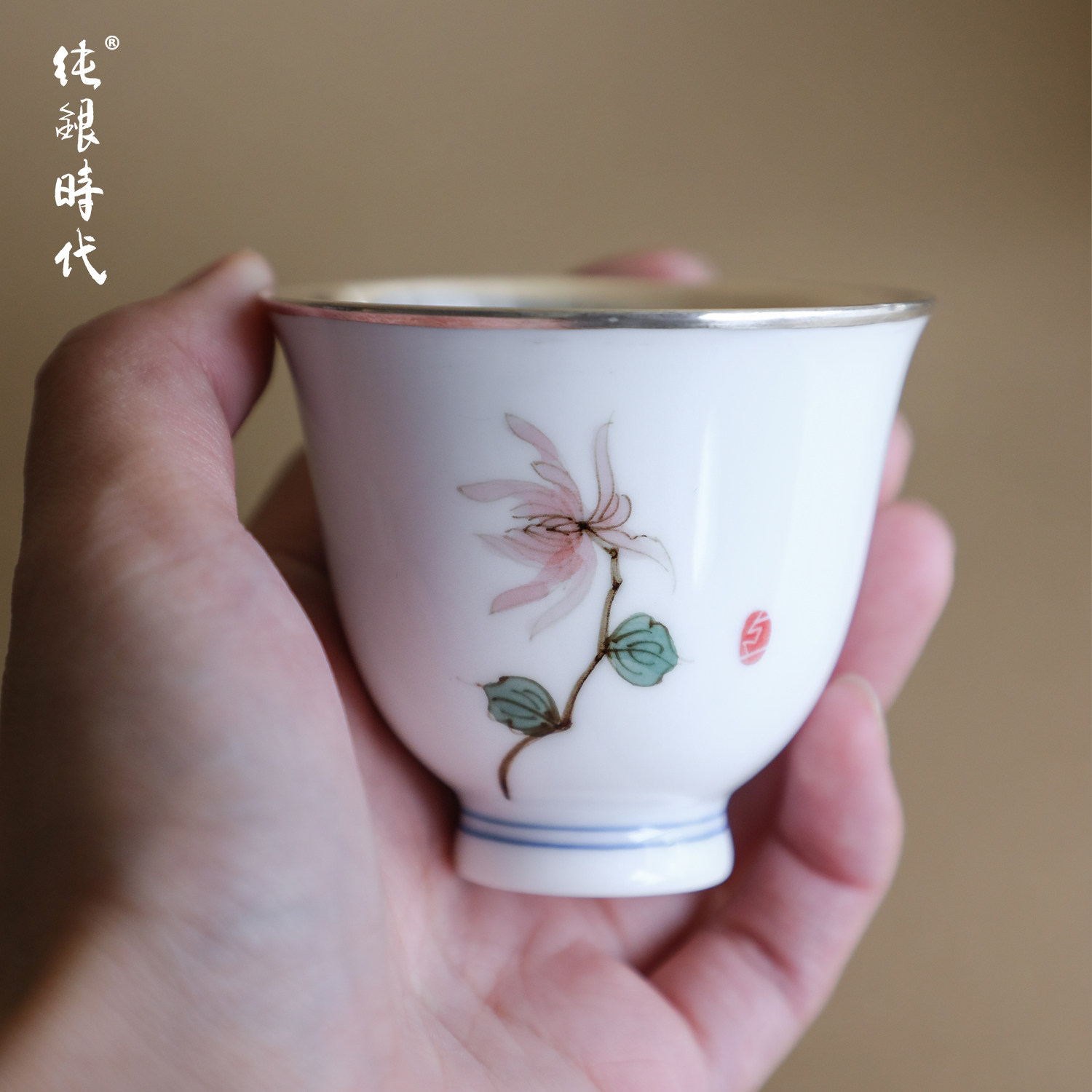 纯银时代四雅之菊瓷包银杯手工