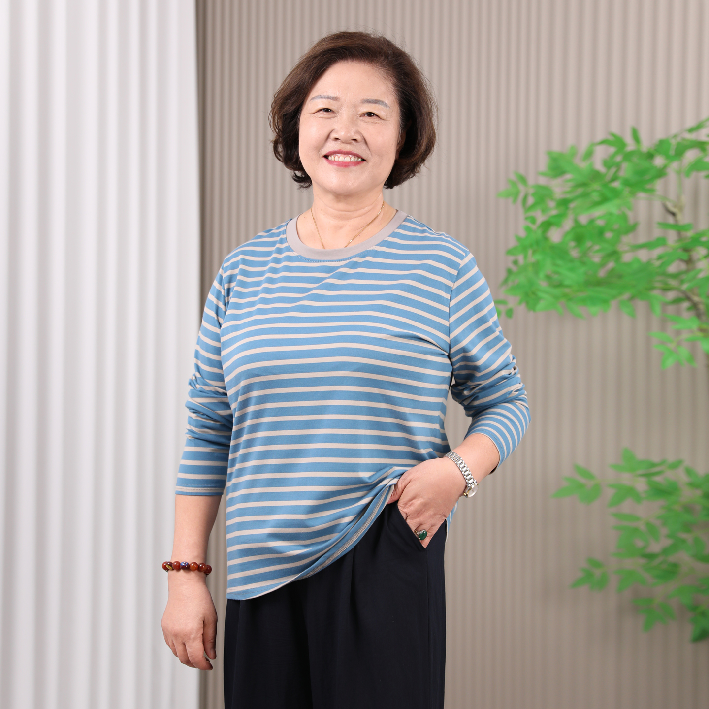 2025春秋装新款女士条纹长袖t恤中年妈妈大码女装宽松遮肚子上衣