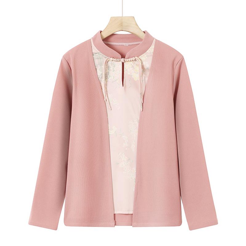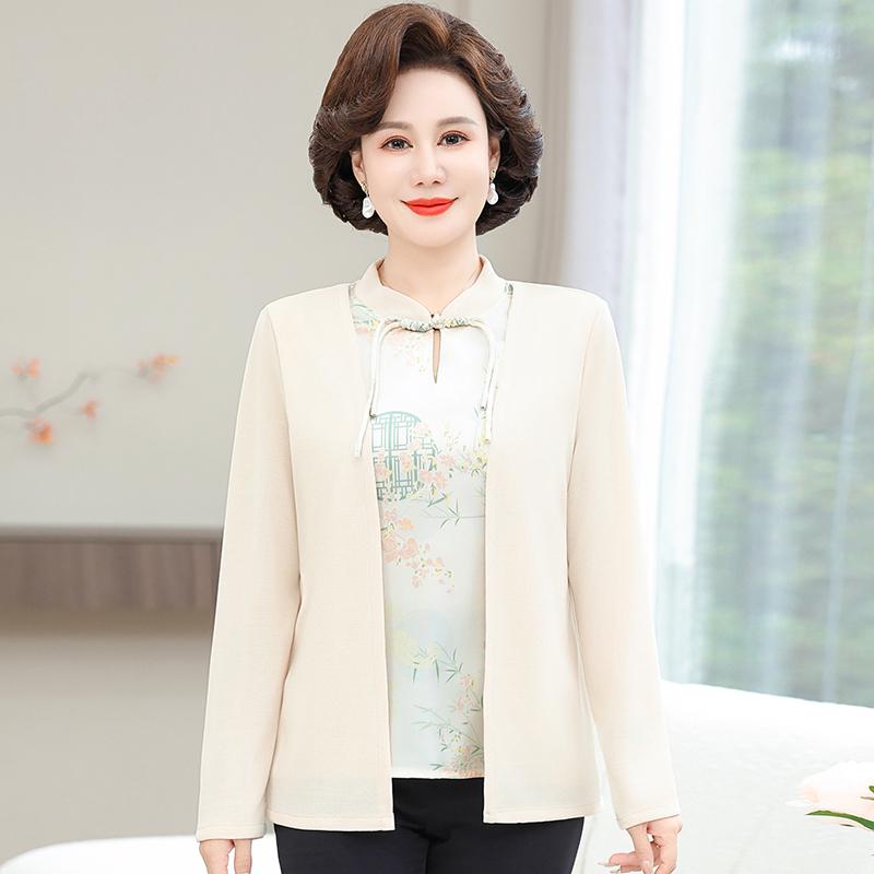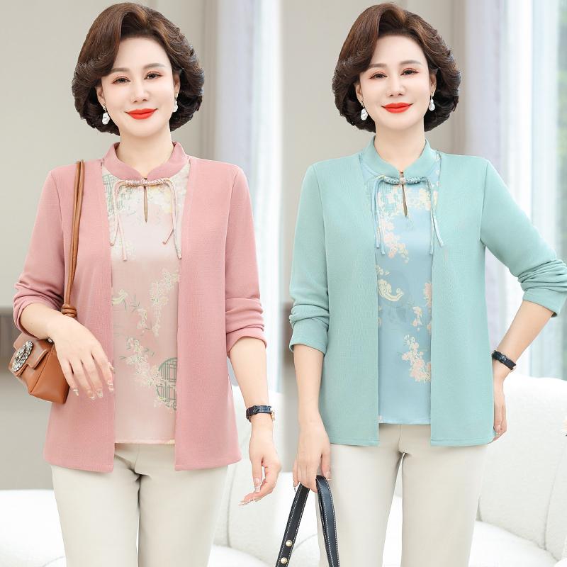 妈妈春秋新款国风长袖上衣两件套中老年时尚女秋装假两件打底小衫
