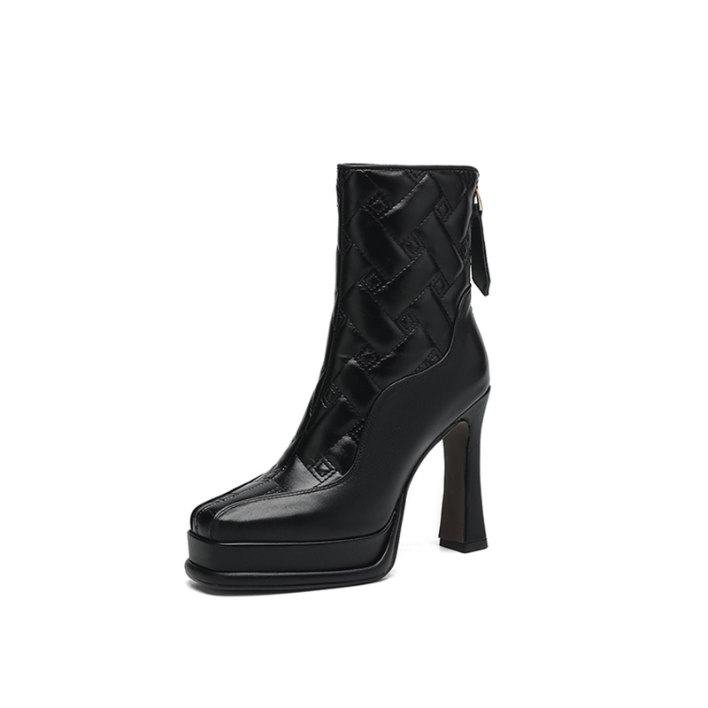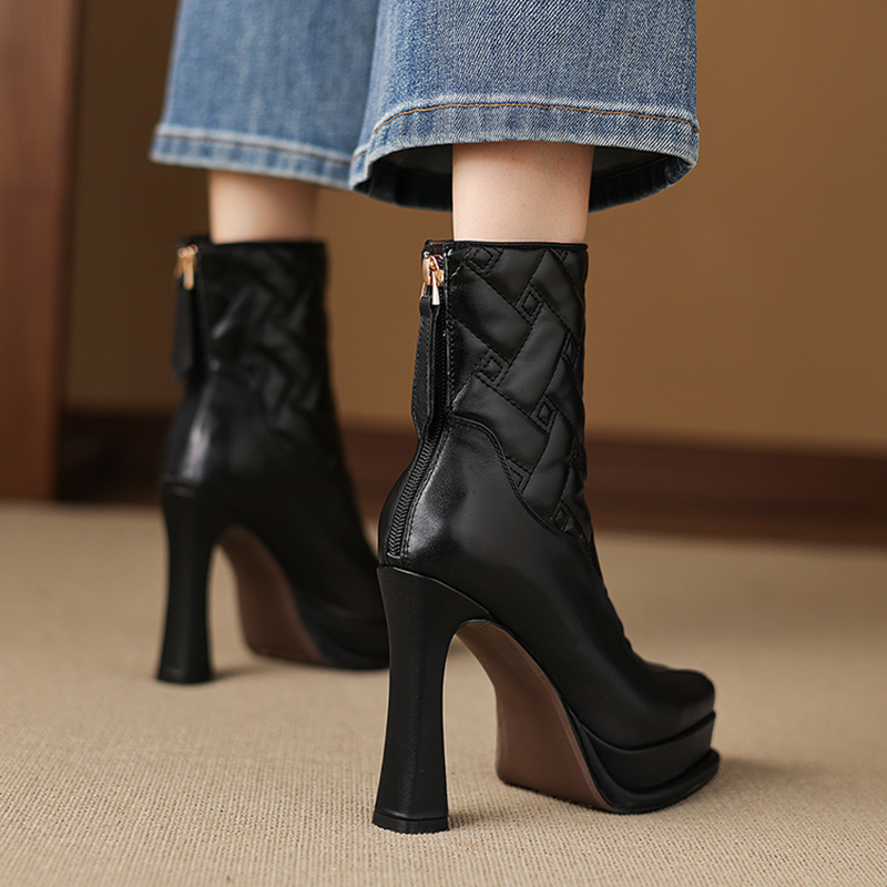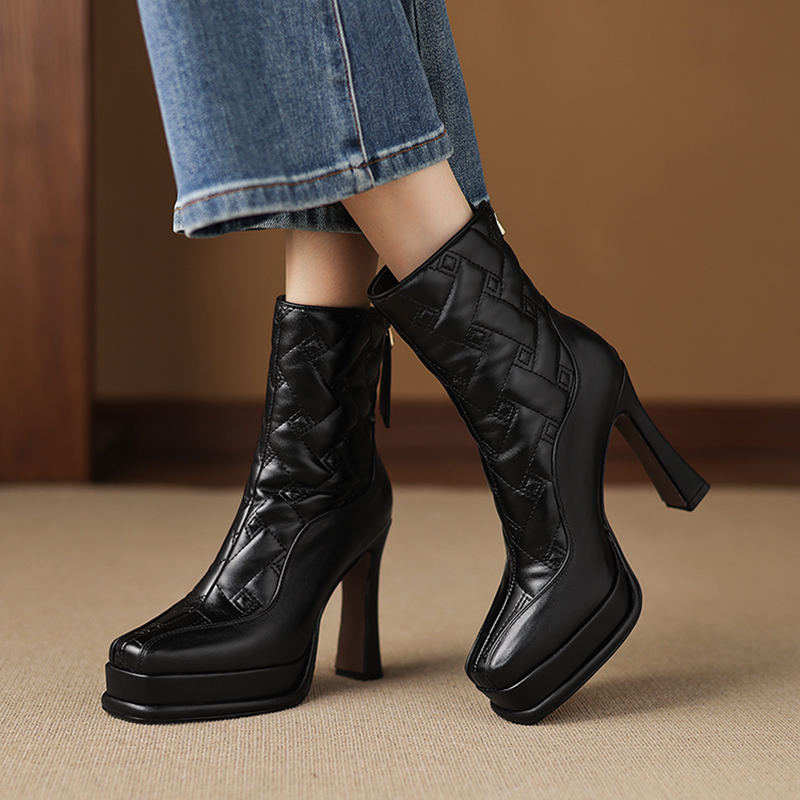 米色方头防水台高跟短靴女粗跟厚底尖头时尚时装靴不累脚春秋单靴