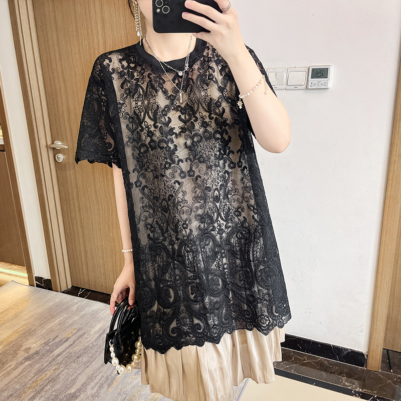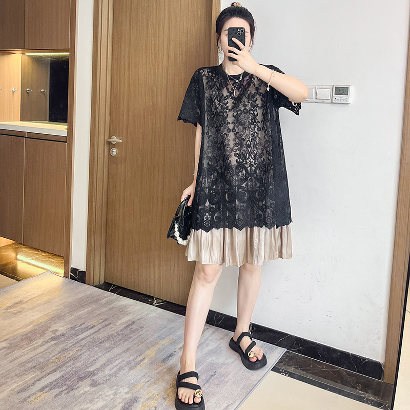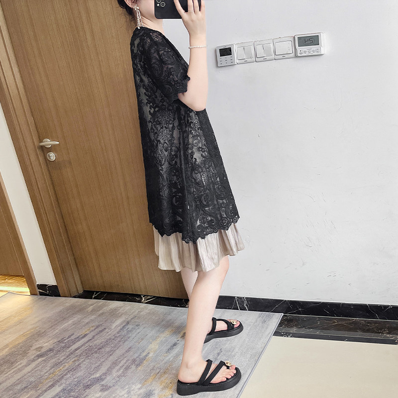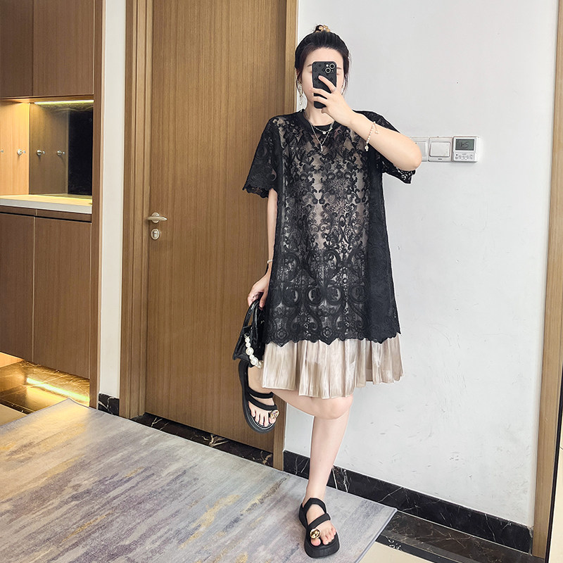 大码女装2025胖MM短袖中长款蕾丝拼接两件套夏季新款连衣裙套装