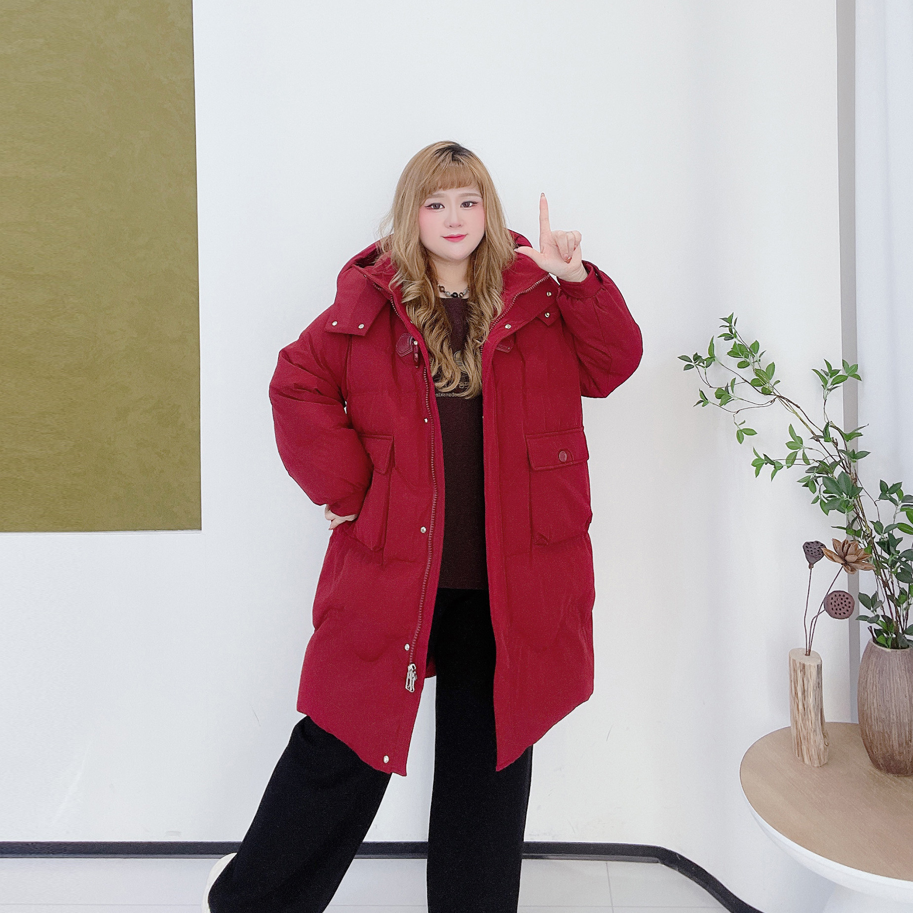 复古牛角扣松弛感遮肉厚外套胖莹莹大码女装冬季中长款连帽羽绒服