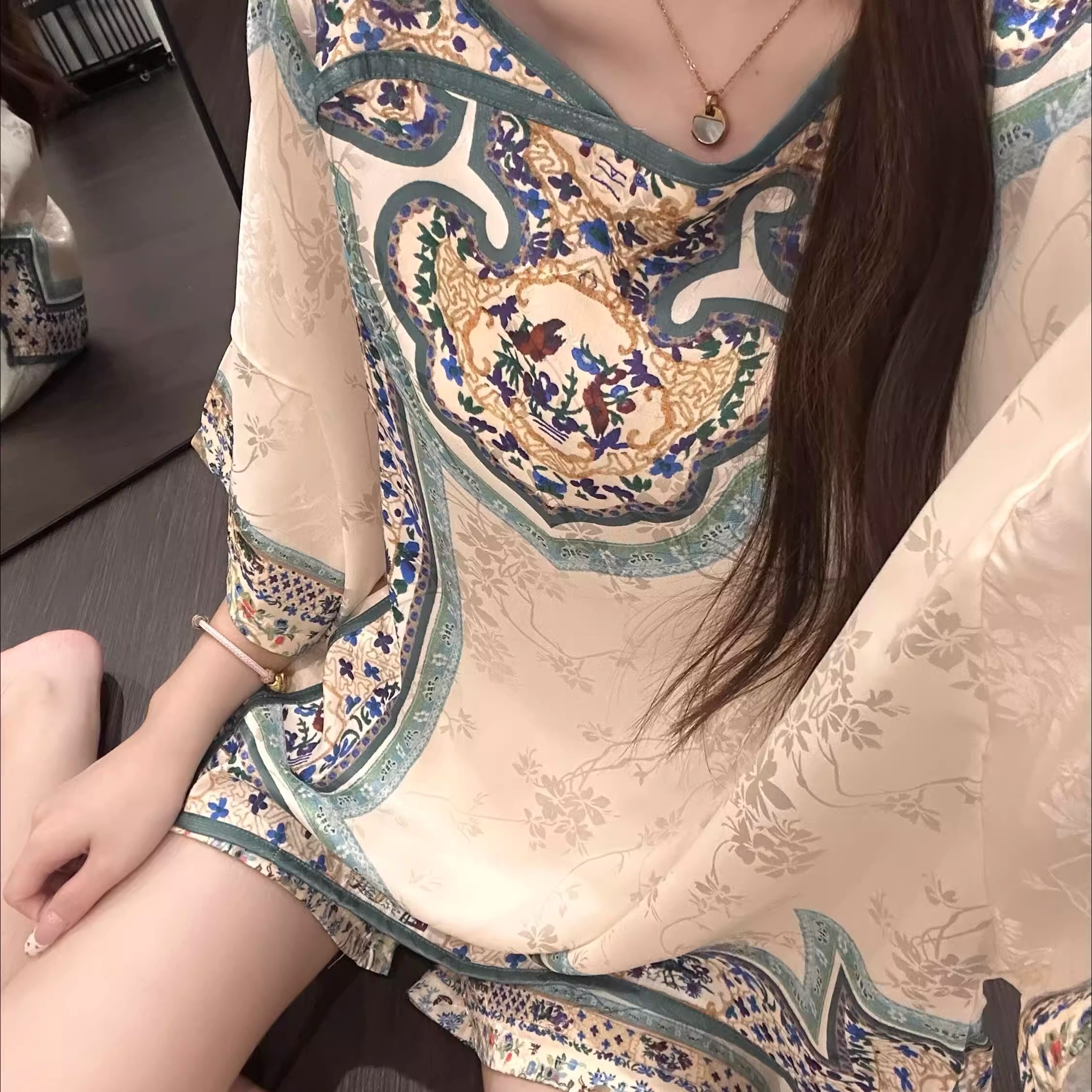 胖mm2-300斤国风复古提花冰丝睡衣女春秋大码短袖长裤家居服套装
