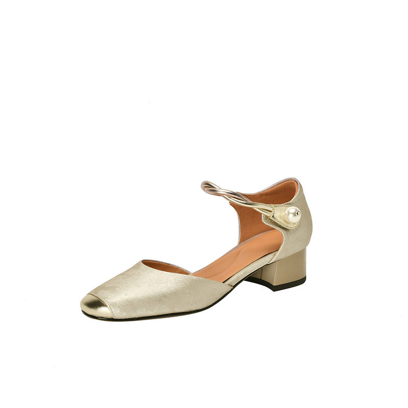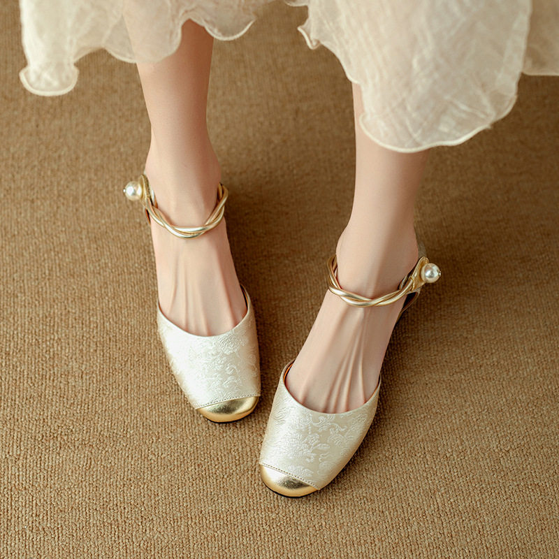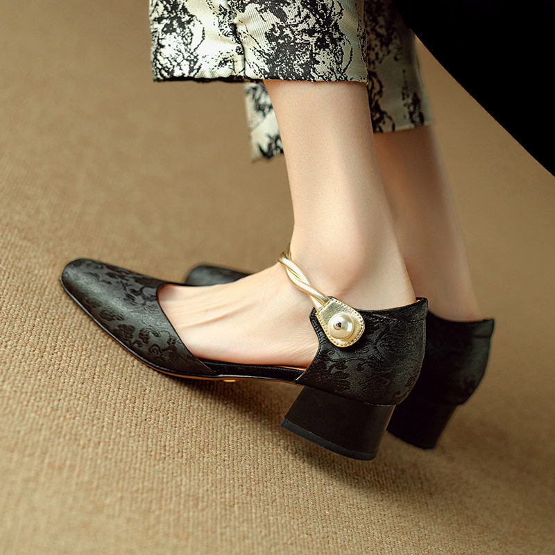 法式新中式包头凉鞋女夏季真皮刺绣中粗跟一字带玛丽珍鞋中空单鞋