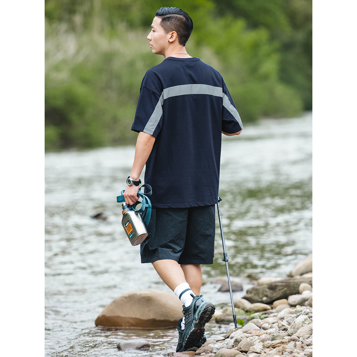 男夏季260g户外反光条短袖T恤 口袋装饰宽松五分袖潮