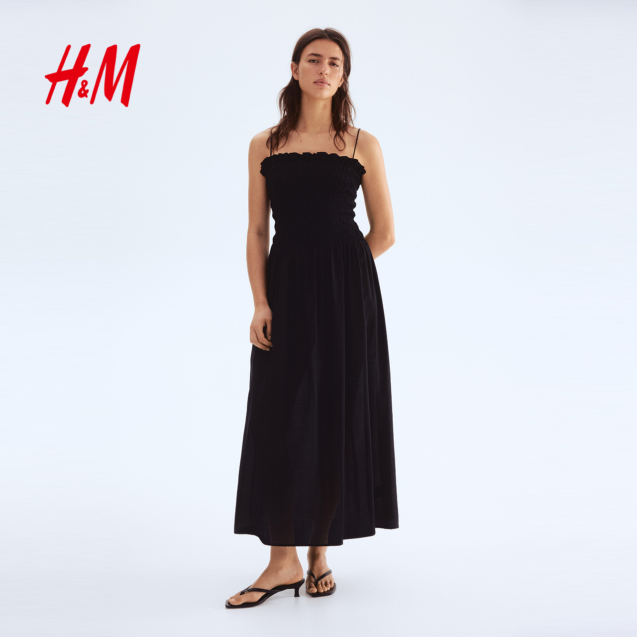 HM女装无领连衣裙2025夏季新款无袖缩褶植物印花吊带长裙1275861
