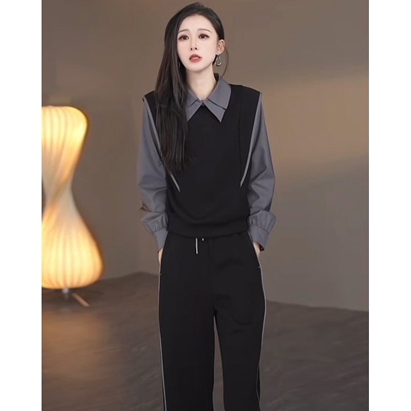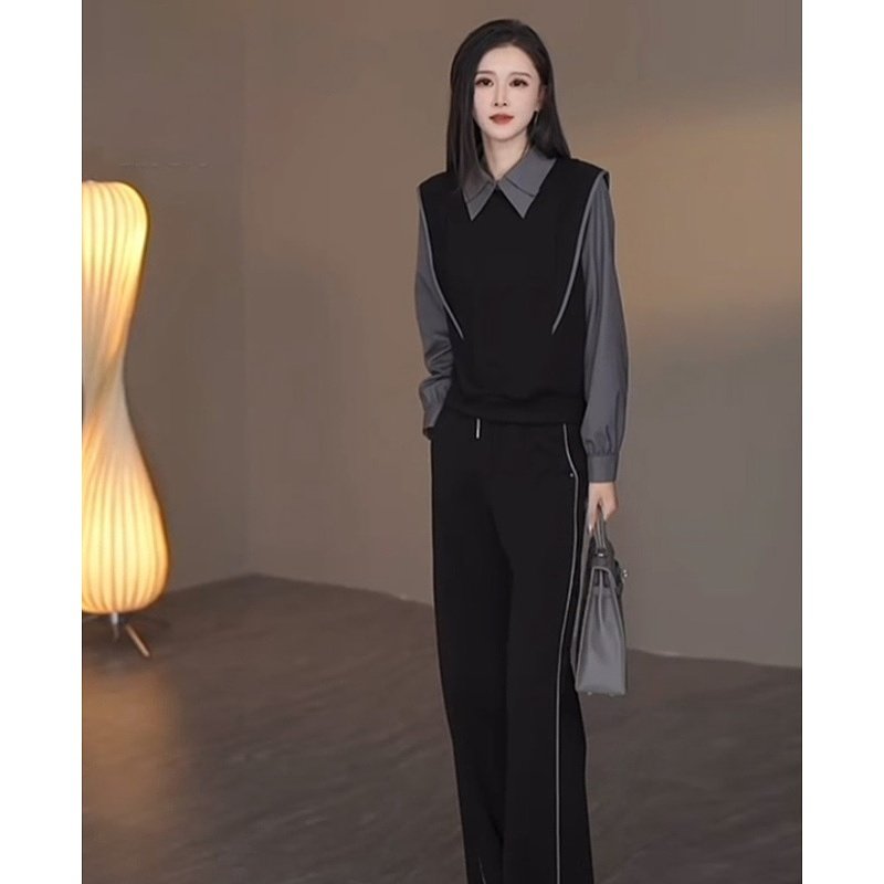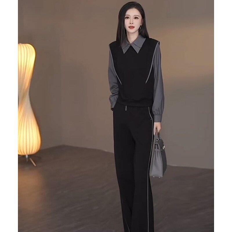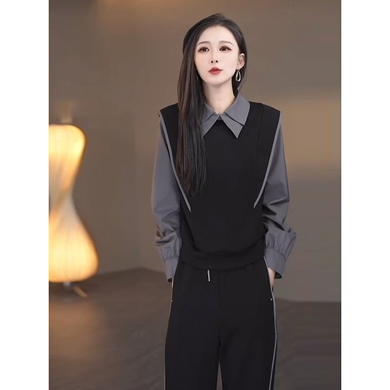 撞色拼接翻领上衣阔腿裤两件套女2024秋季新款气质感休闲时尚套装