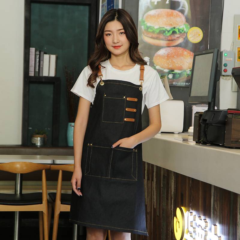 牛仔围裙印logo餐厅咖啡师奶茶店花艺理发师背带工作服围腰无袖