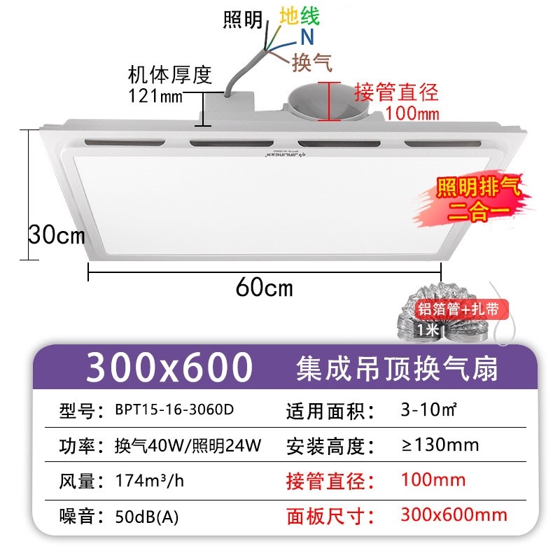 金羚集成卫生间照明二合一排气扇风机300x600卫生间换气扇天花抽