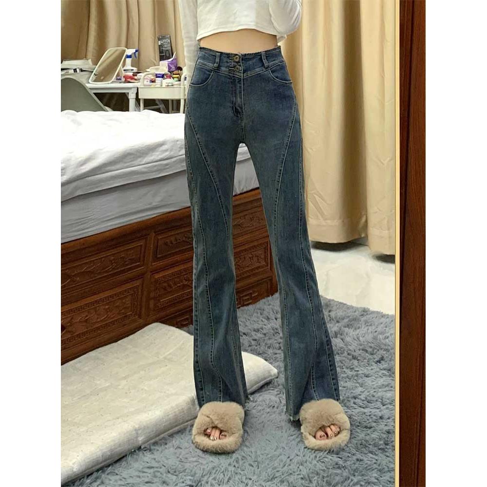 77052-042毛边高腰微喇美式复古蓝牛仔裤大码女胖mm显瘦梨型身材