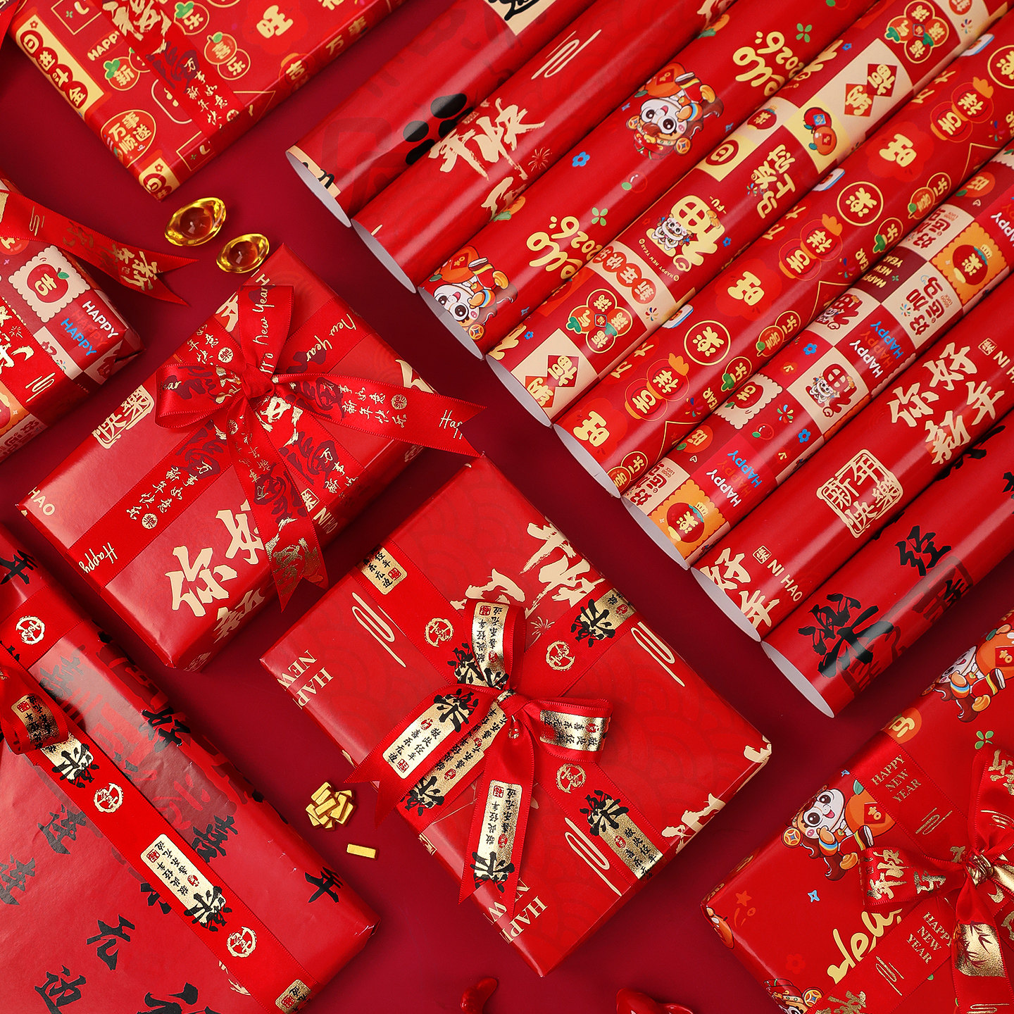 新年礼物包装纸大红色花束牛皮纸鲜花包花纸盲盒礼盒春节过年布置
