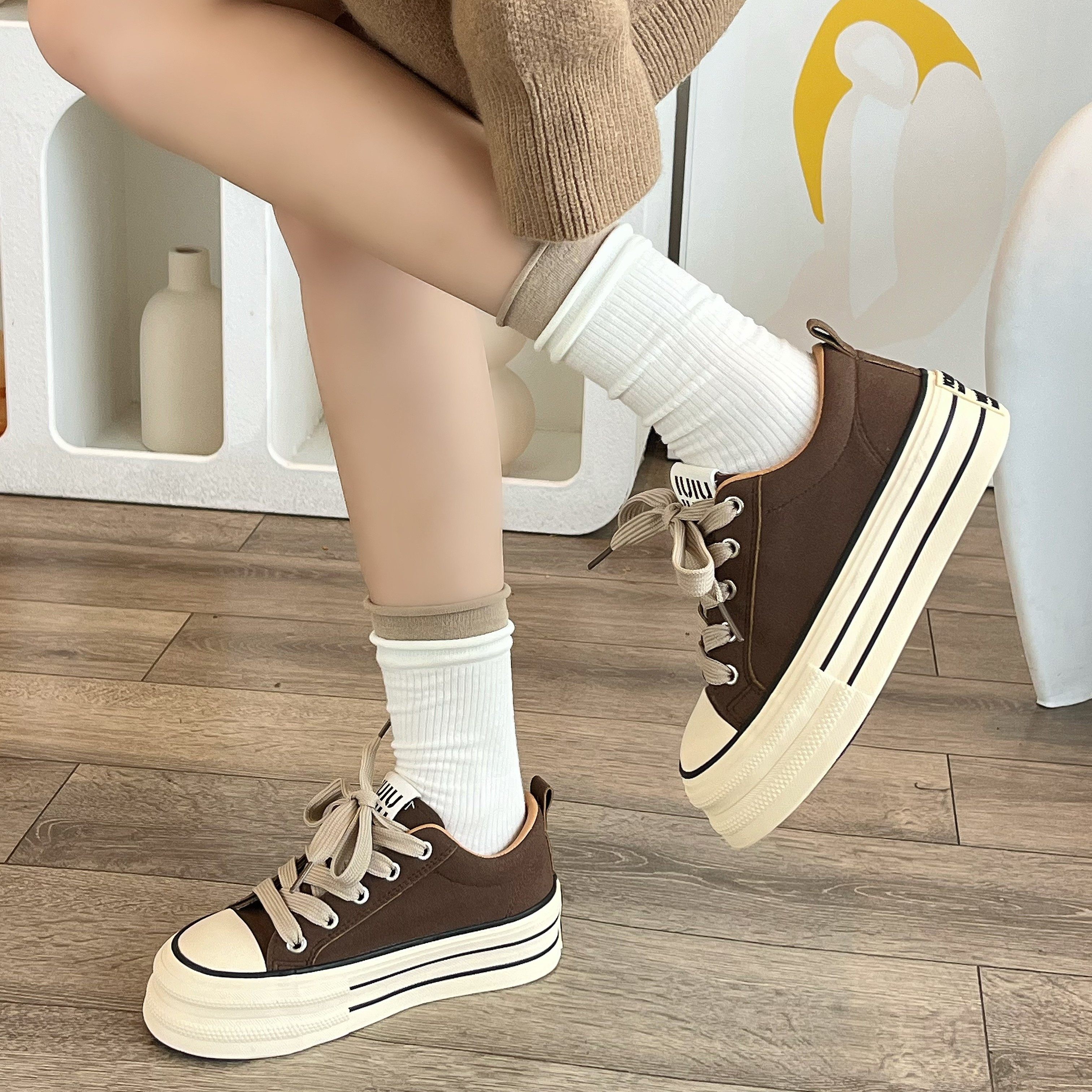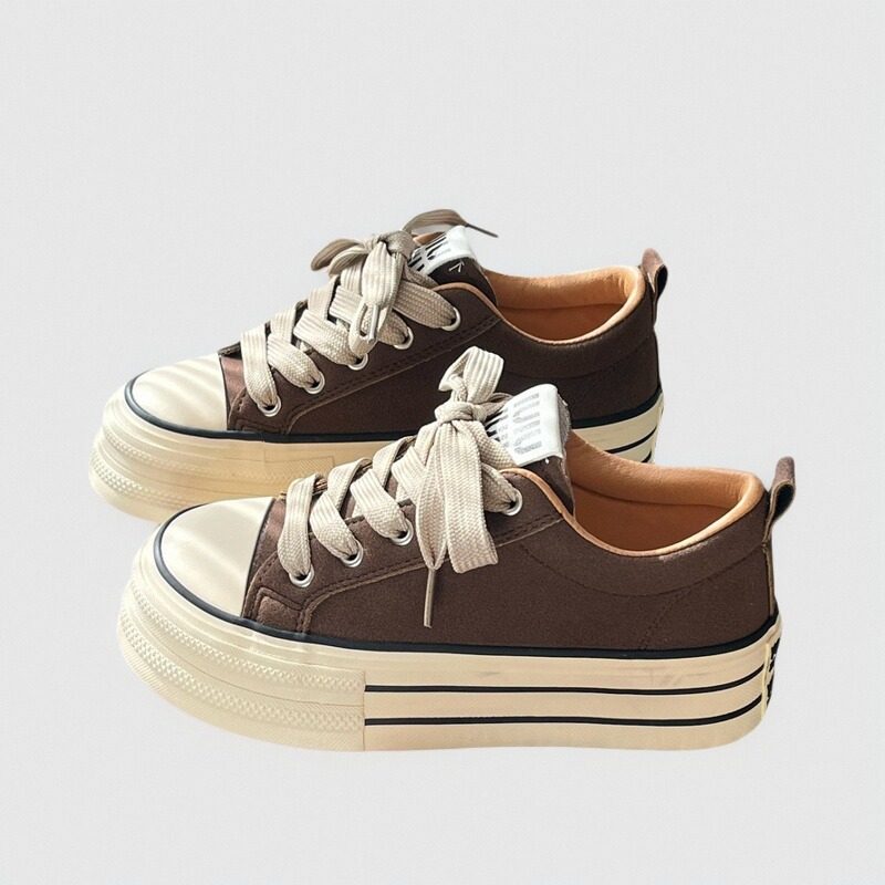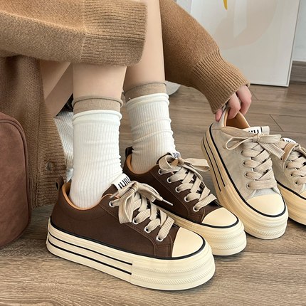 美拉德棕色厚底帆布鞋女2025秋季新款百搭增高松糕小白鞋学生板鞋
