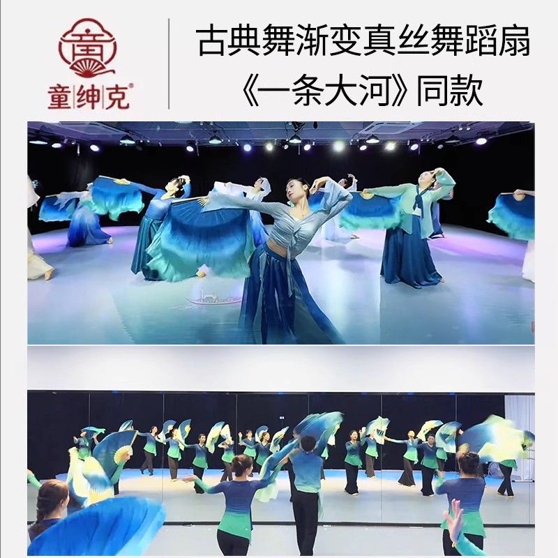 扇子舞蹈扇真丝蓝色渐变青绿双面一条大河古典舞跳舞专用演出道具