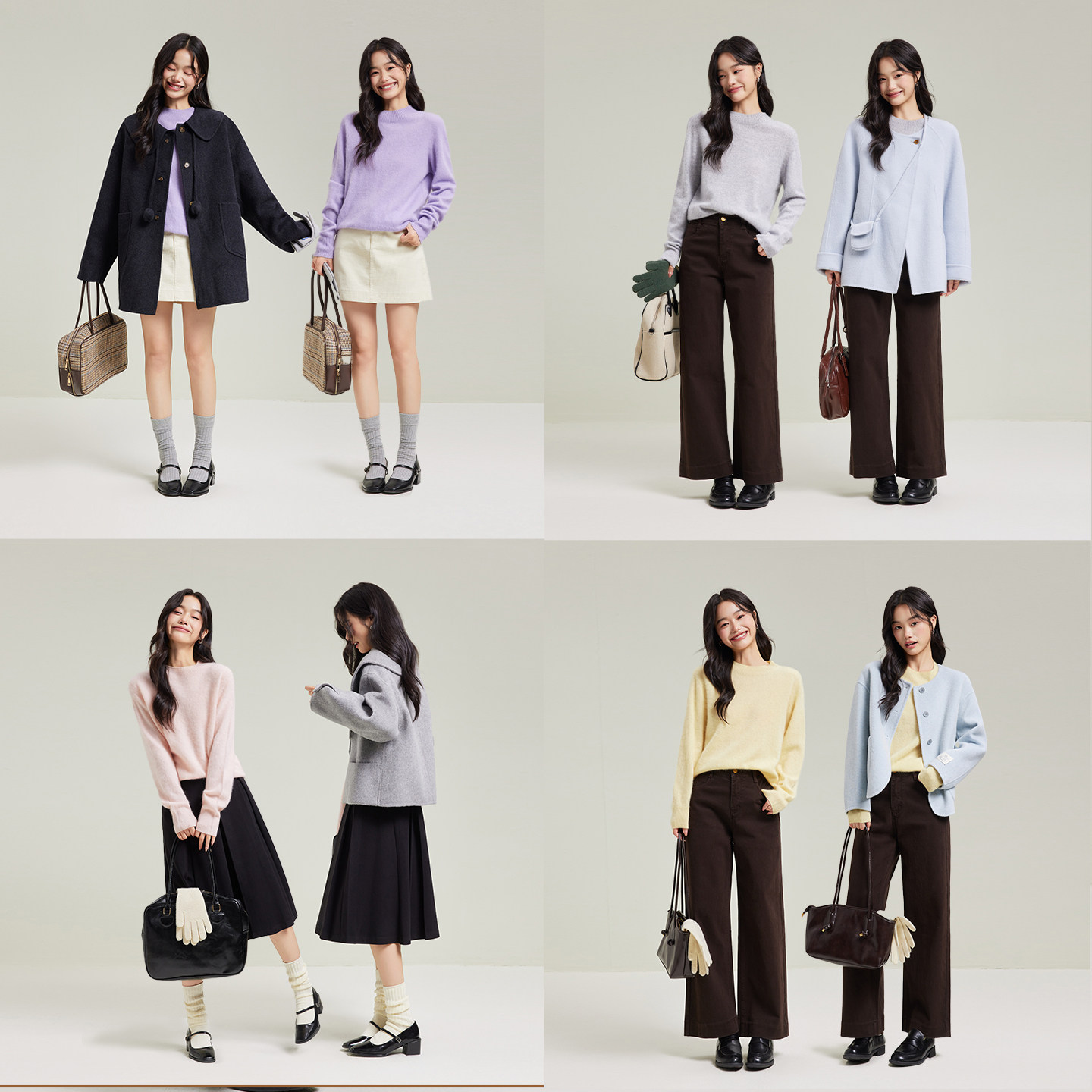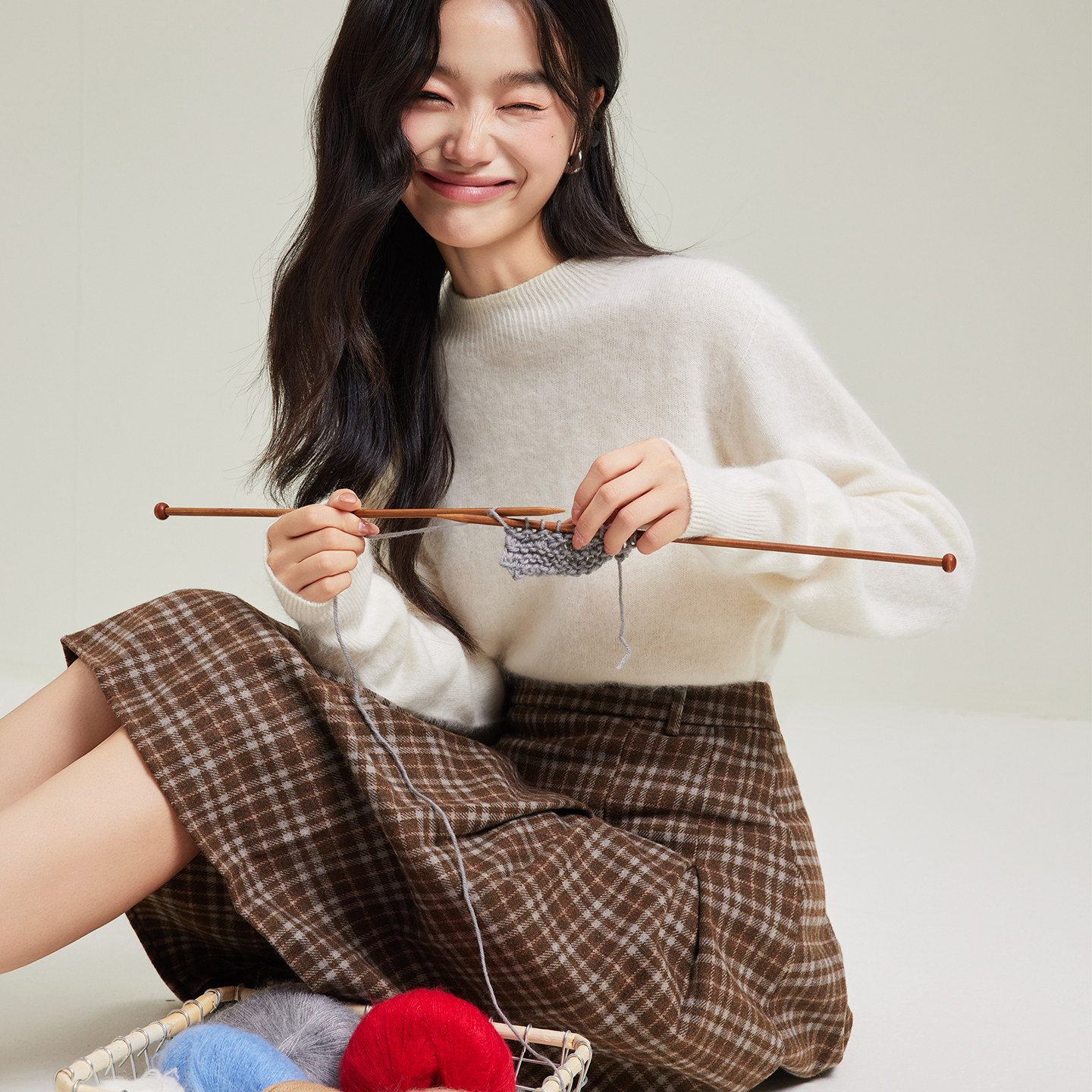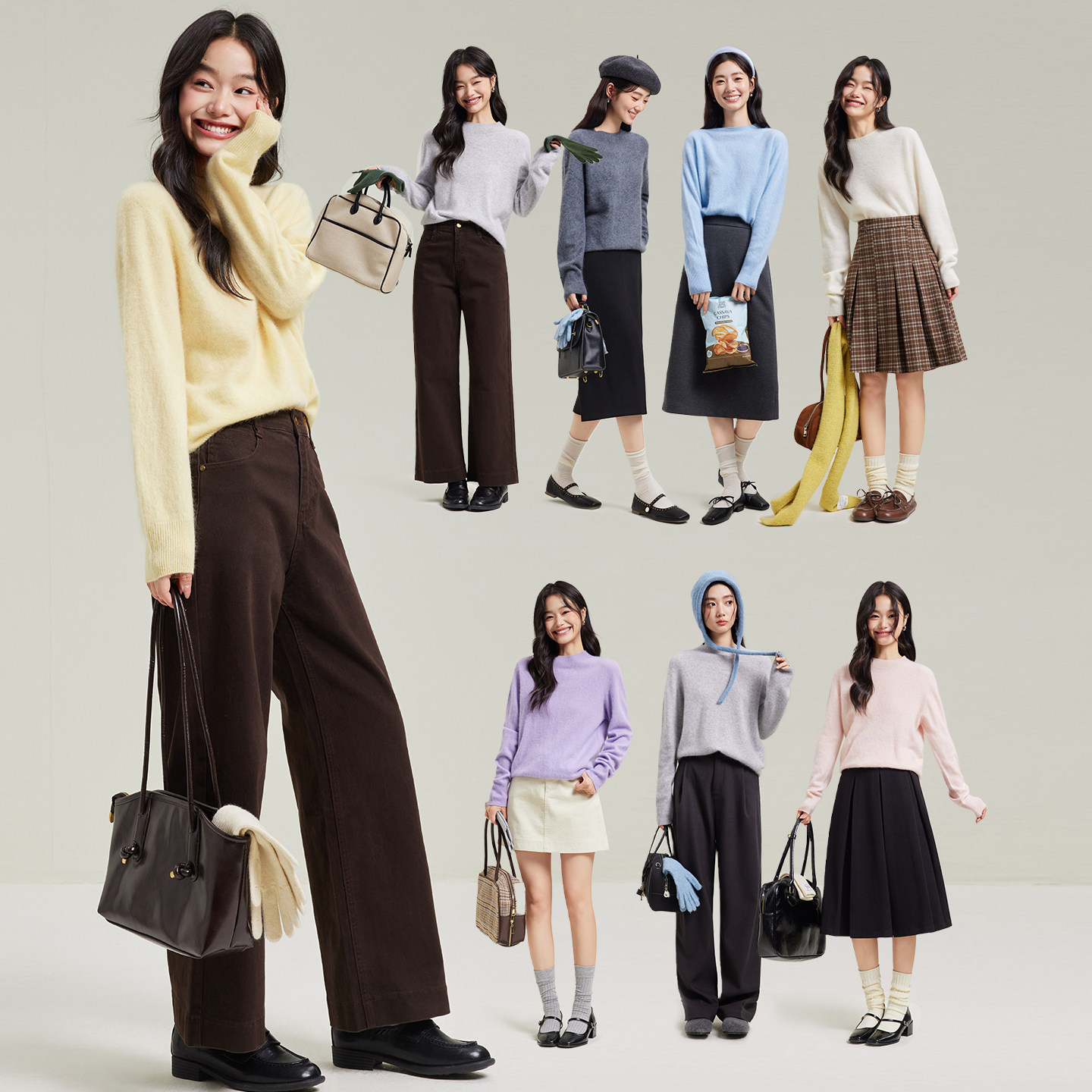 图曼朵粉色绵羊毛针织衫女秋冬韩系圆领套头羊绒衫纯色羊毛衫上衣