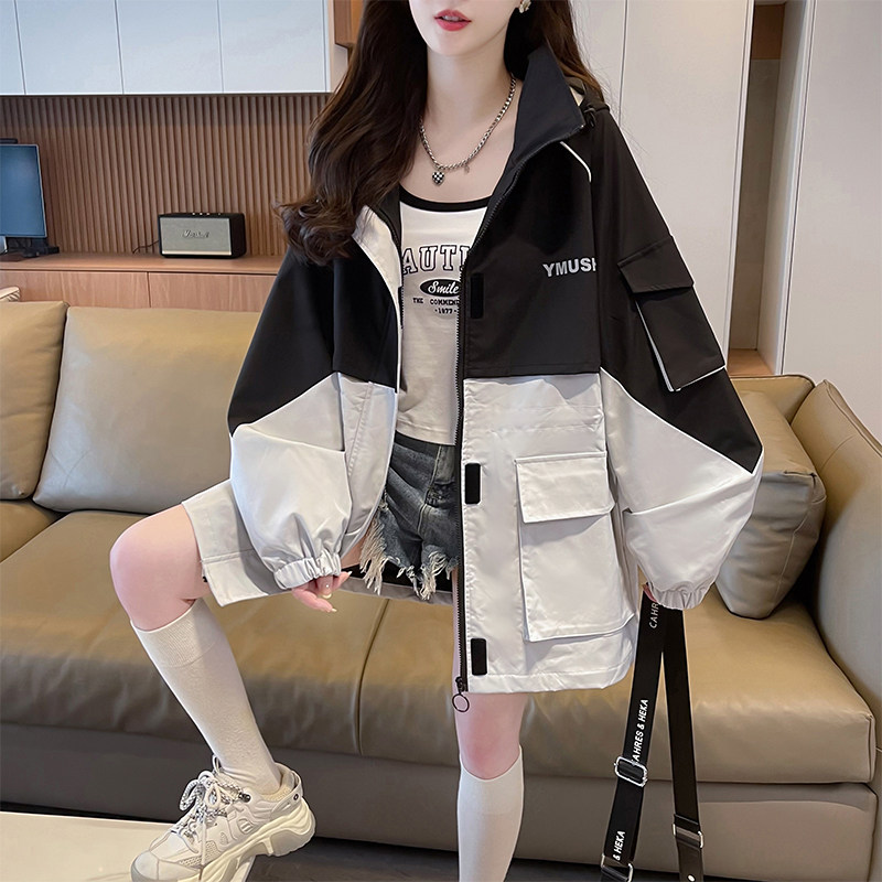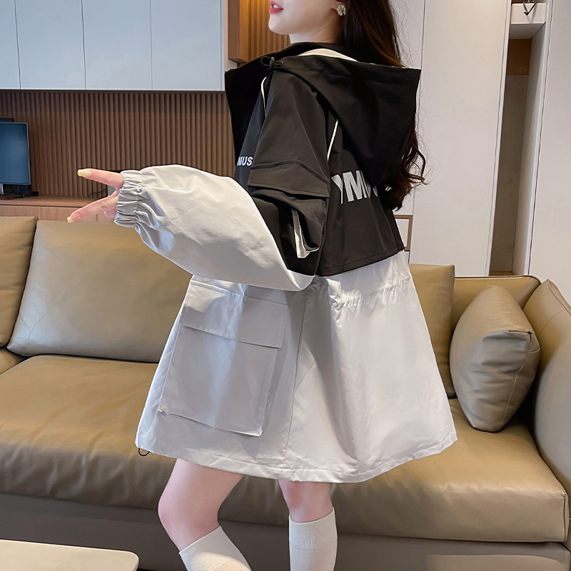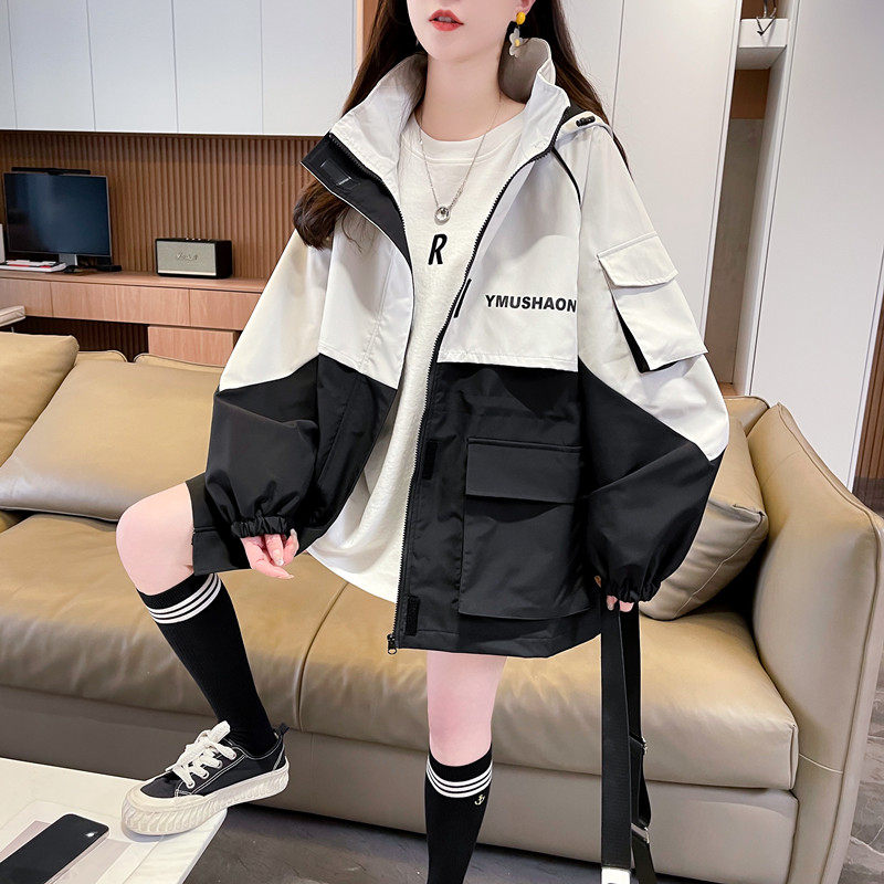 美式拼接冲锋衣外套女2025春装新款宽松大码休闲学生连帽工装风衣